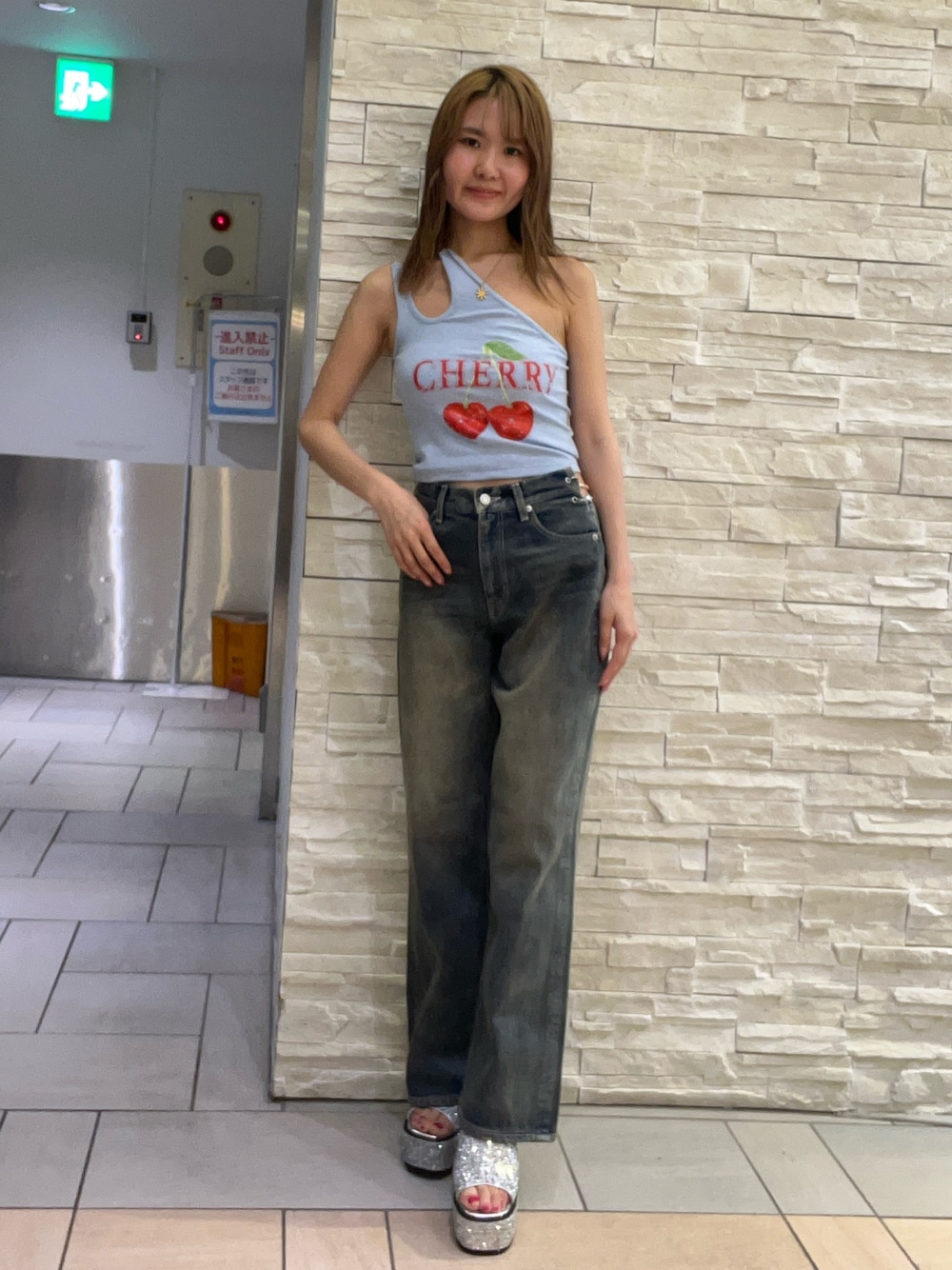 【トップス】 チェリーのロゴが入った可愛すぎるトップス❤️🔥ワンショルバックがチェーンになっています💕 【ボトムス】 去年も大人気だったビジュシリーズのデニムパンツ👼🏻 ビジュが取り外し可能なのでオーバーサイズのトップスで合わせる際はオフしてシンプルなデニムで着るのも◎ 162cmSサイズ着用で足の甲に付くぐらいの丈感です! 【シューズ】 キラキラが夏にピッタリなサンダル☀️ 個性が光るデザインです! 普段サイズ24.5cmでLサイズ履いてます🫶