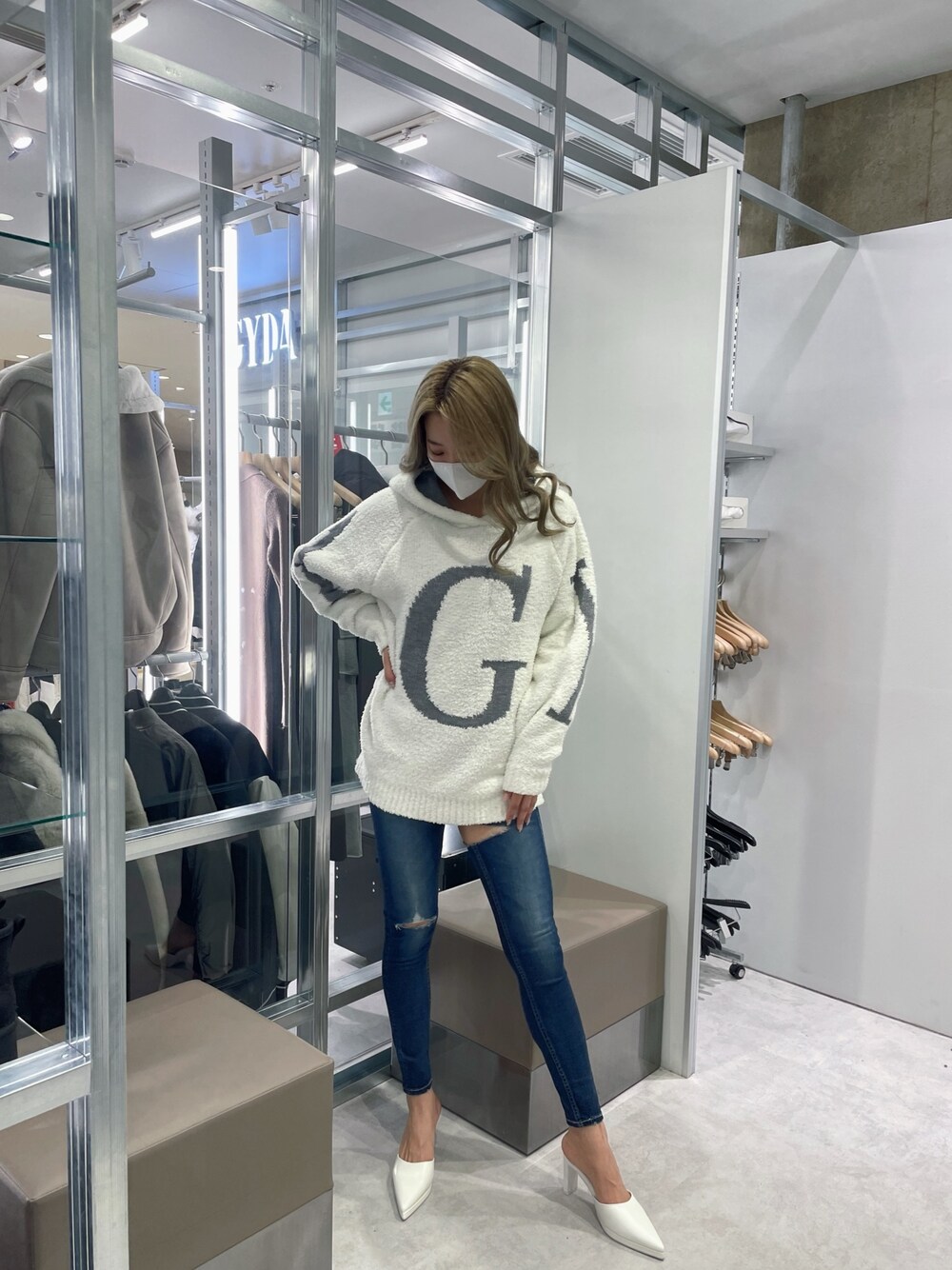 GYDAロゴのニットパーカー!! モコモコのニットの素材感が肌触りよく着心地抜群トップスです!💖 170cmの私でもお尻隠れるので、短いボトムスと合わせてワンピ風に着るのも可愛いです!!