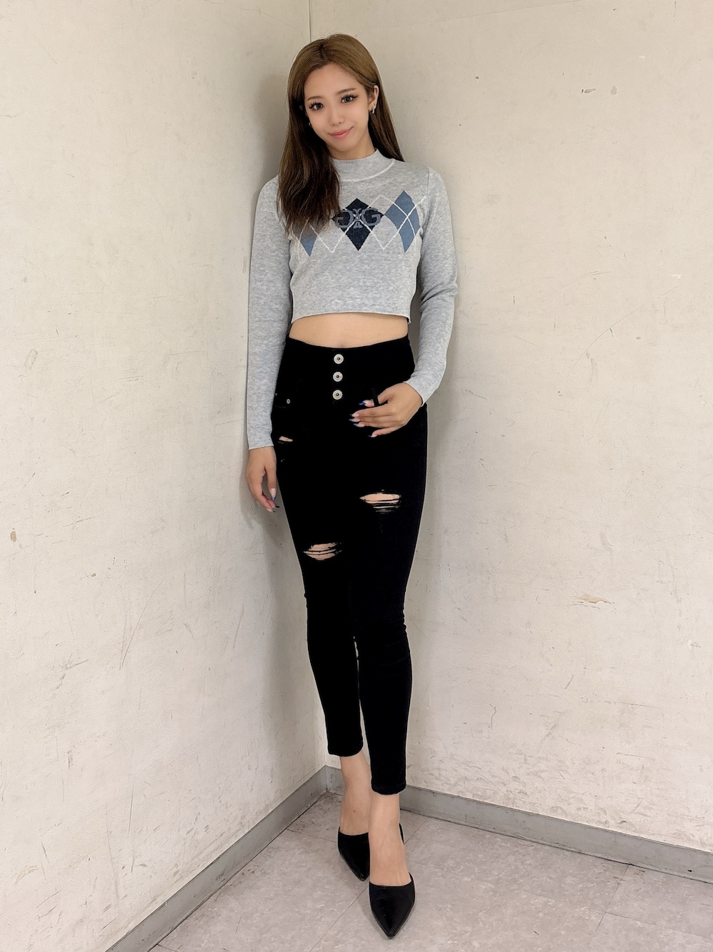 【トップス】 細身のシルエットのニットトップスは伸縮性抜群となっています。symmetryGYDAロゴがアーガイル柄になっており、ラメ糸がミックスされているのもポイントです💖 【ボトムス】 GYDA大人気のウエストクロスシリーズのダメージバージョンです!!さり気ないダメージ感で色々なコーデに合わせやすいアイテムになっています☺️(170cmでSサイズ着用) 【シューズ】 GYDAの大人気のミュールは、ポインテッドの形で美脚効果抜群です!つま先部分は厚底になっているため、高低差が減り歩きやすさ抜群です!!!(24.5cmでLサイズ着用)