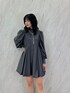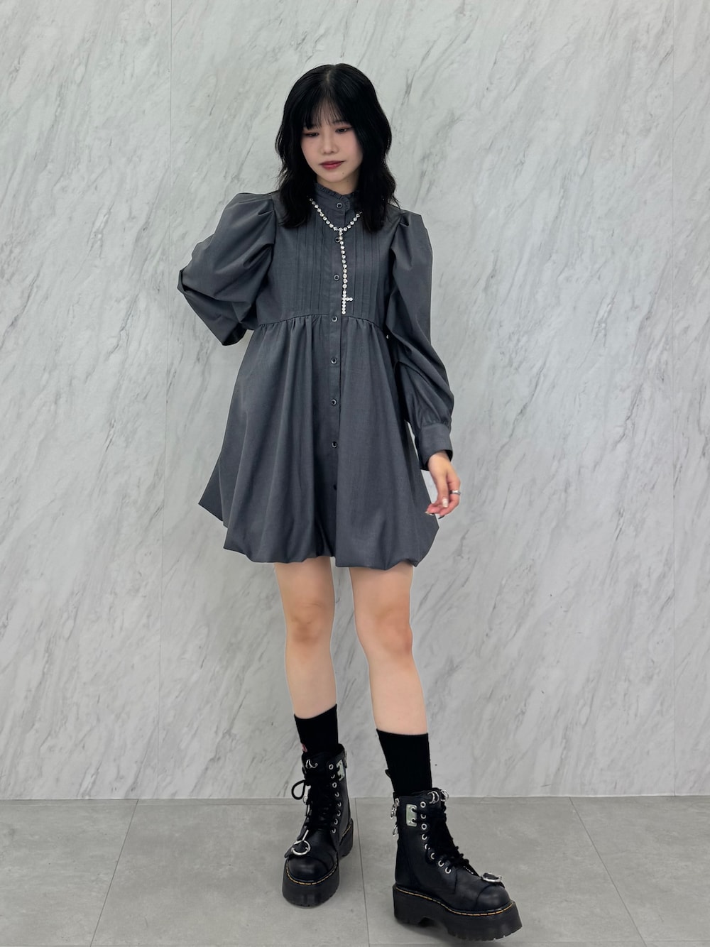 【ワンピース】 →バルーンチュニックワンピース バルーンの形が可愛過ぎる...🩶 一枚でサラッと着れるワンピースです パフスリーブなのとバルーンスカートで女の子らしい形もありながら、胸下からの切り替えで脚長効果&スタイルアップ効果も🙆♀️ 164cmで短すぎないくらいの丈感なので、高身長さんから低身長さんまで幅広い身長の方に着ていただけます🩶 冬は上から大きめのアウターきても絶対可愛いですね🥹