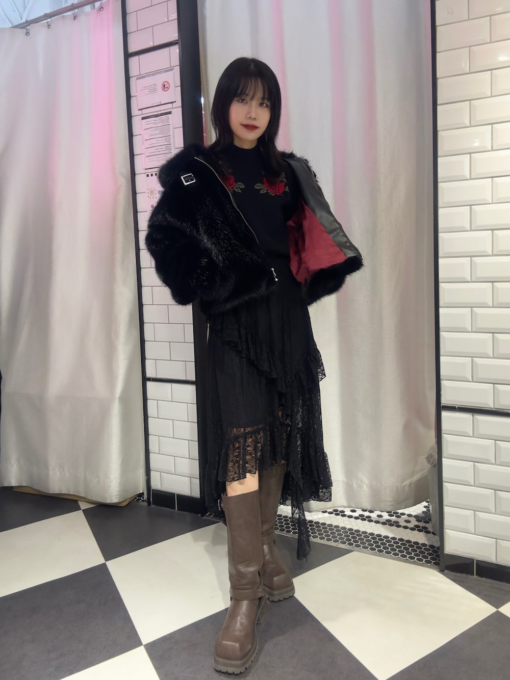 【アウター】 #ベルトミドルファーコート トレンドのファーコート✨ ショート丈なのでスタイルアップ間違いなし...!!! 裏地の色も赤色で可愛く、なんと襟立てていただくとマフラーいらずであったかく防寒の面もバッチリです👌👍💜 重厚感あって高級感ある見た目ですが、軽すぎるのも魅力😍 ストレスフリーにこの冬大活躍間違いなしです...!!! 【トップス】 #ローズジャガードロゴニット 薔薇のプリントが可愛すぎるニット🥀 体に沿うようなラインですが、ピタッとしすぎていないので着心地も抜群のアイテムです👌 【スカート】 #イレギュラーフリルレーススカート アシンメトリーなレースが可愛すぎるレーススカート✨ インナー付きなので一枚でサラッとオールシーズンお使いいただけます! デニムなどレイヤードしてトレンドのスタイルにしても絶対可愛いですね...😍