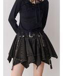 【ジャケット】→ フェイクレザースタッズブルゾン スタッズ使いがハード×ヴィンテージライクなjouetieらしいブルゾン。 特にブラウンとピンクはウォッシュ加工風の生地でよりこなれた印象に。 オーバーサイズ過ぎず、ちょうど良い丈感なのでミニ丈やロング丈ワンピースなど様々なコーディネートに合わせやすいです。 【スカート】→ アシメヘムデニムミニスカート ハードな加工感とハトメディテール×ガーリーなボリュームフレアシルエットで他には無いエッジの効いた印象に。 丈の長いアイテムの裾から少し覗かせるスタイリングもおすすめです。 足元は重ためブーツがjouetieの鉄板!ハイソックスやレースタイツなどを合わせて今っぽくアレンジ♪