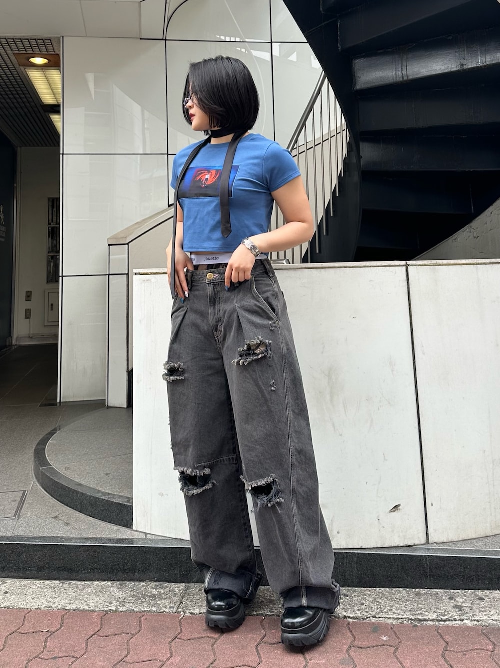 【Tシャツ】jouetie×チェンソーマンコラボTシャツ!クロップド丈がトレンドのあるデザインで、ハイウエストボトムスと合わせると脚長効果抜群です◎ 【デニム】154cmMサイズ着用。腰からゆったりとしたシルエットで着たい方は多いサイズをおすすめします。丈が長い場合はロールアップしても可愛いです✨