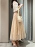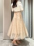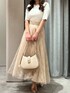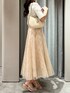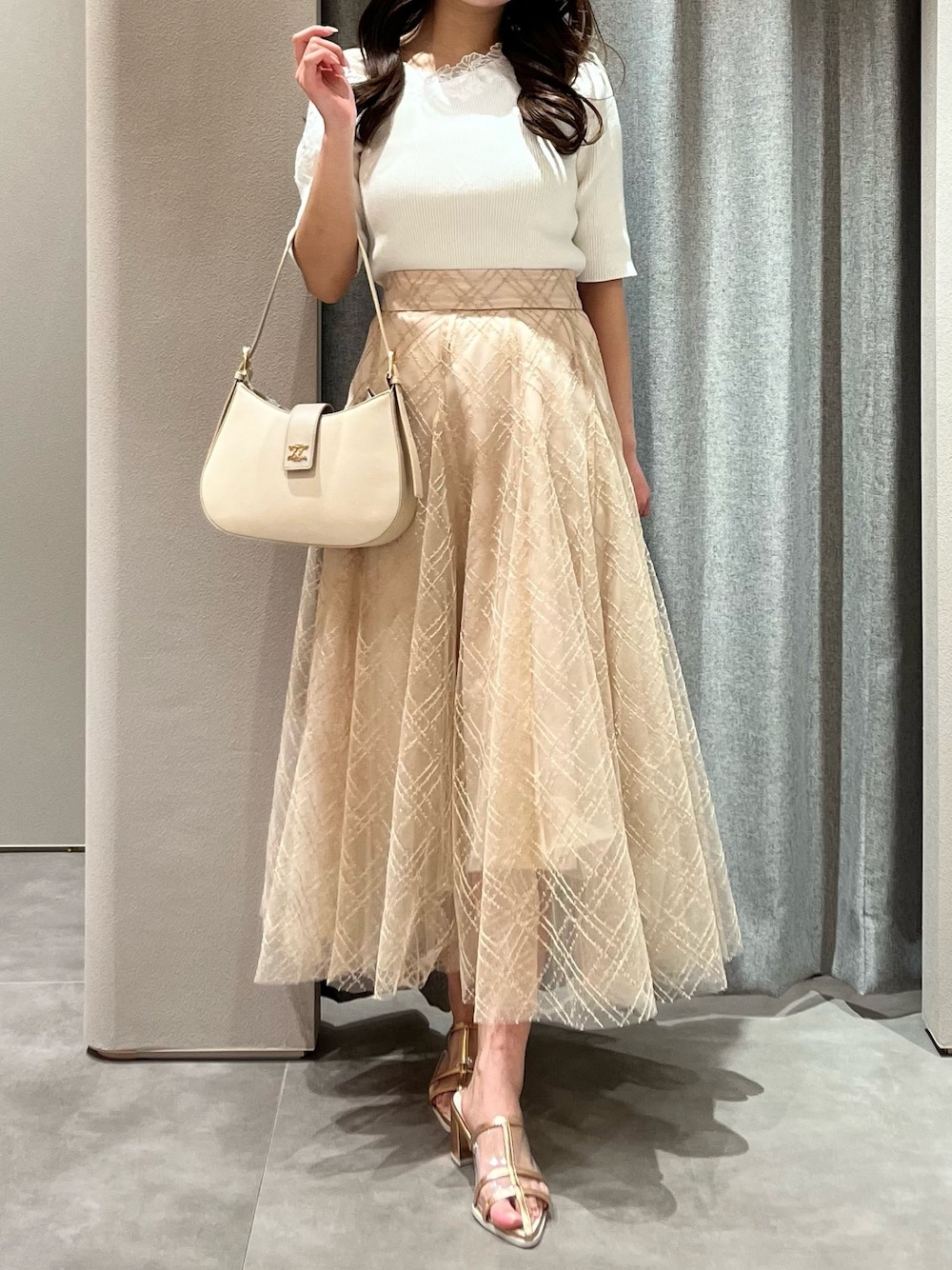 【きれいめコーデ】 ・トップス 襟元がレース仕様になっている為、抜け感を出しつつスッキリ!! 五分袖なので、二の腕も気にならず上品に。.:*☆ ・スカート オレンジは輝かないスパンコールが施されている為、他のカラーよりも落ち着いた印象に!! チュールスカートですが、Aラインのスカートなので着膨れもせずすっきりと着こなしていただけます♪ ・サンダル クリアな素材が、春夏にぴったり♪ ロングスカート合わせで上品に、デニムパンツ合わせでカジュアルに! 足元に抜け感を出したい時、おすすめです。.:*☆