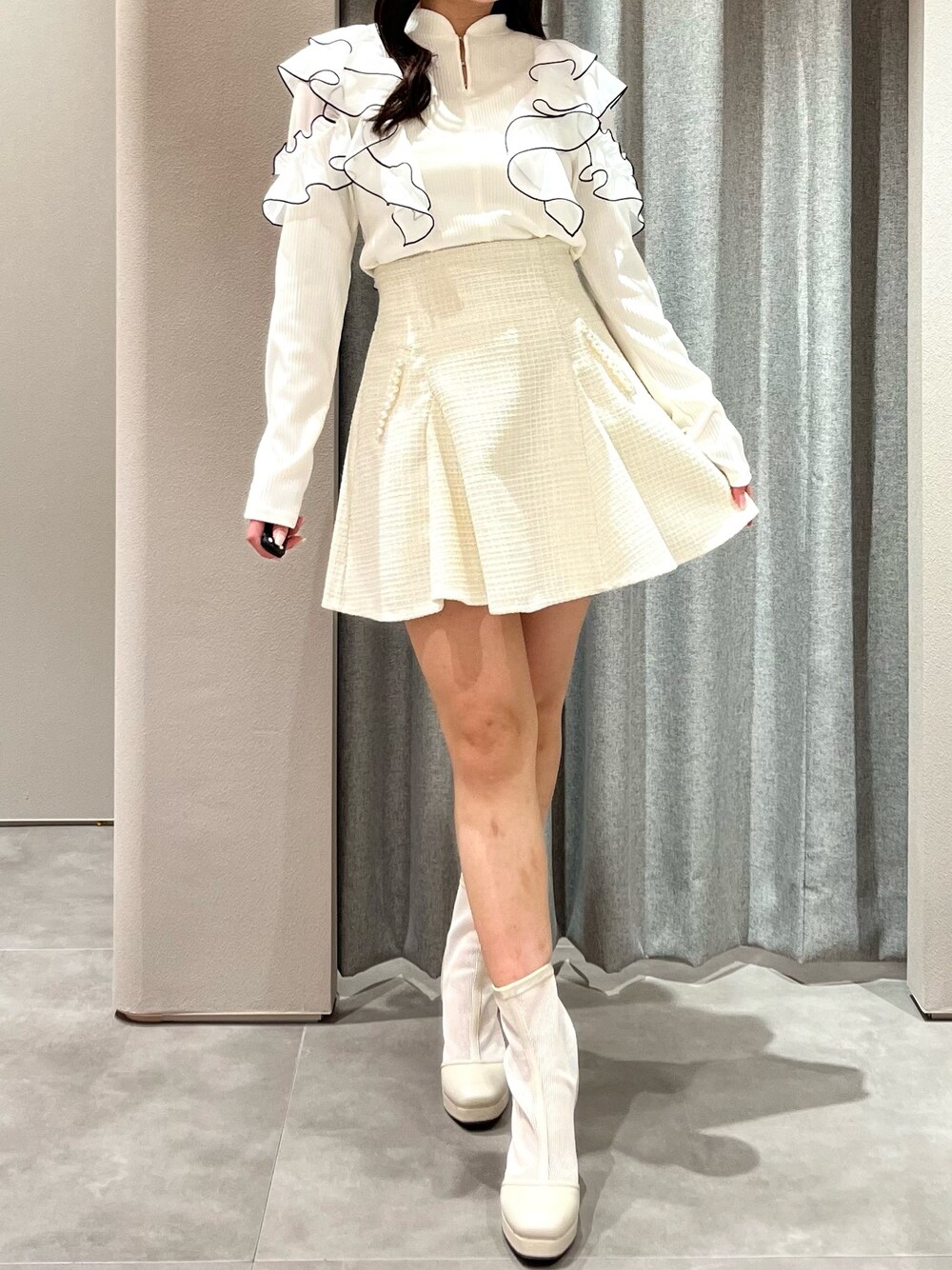 【春のガーリーコーデ】 ・トップス 肩のフリルがあざと可愛いトップス♡" フリルが艶感のある生地感なので、上品に大人可愛く着用していただけます♪ ・スカート フレアの形が細見えを叶えてくれる、神アイテム!! モノトーン双子コーデで、ライブ参戦するの絶対可愛い❤︎" ・ブーツ 普段21.5〜22.5cmの私は、低反発で分厚めの中敷を入れて毎日着用しています!! どんなコーデにも相性抜群で、スタイルアップしてくれる神アイテム✨ 今季のブーツはこれで決まり♡"