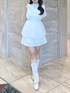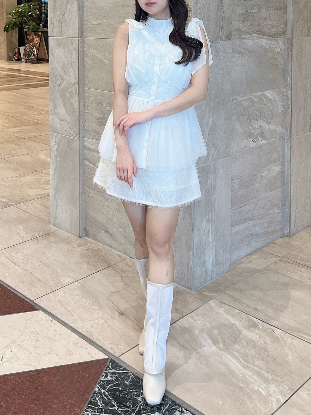 【ホワイトコーデ🤍】 ・ビスチェ 肩のリボンで甘さを出しつつも、シンプルなシアー生地で大人っぽさを演出♡ シーンに合わせて雰囲気を変えられる、万能アイテムです!! 長袖のインナーを合わせると冬でも着られるよ! ・インナー さりげないラメ感が可愛いノースリーブ。.:*☆ 一枚で着ても、レイヤードしてもお洒落見え! 秋口まで大活躍のアイテムです♪ ・スカート 秋を先取り出来るシャギースカート🍂 今からでも着られる、さらっとした生地感です♪ インナーパンツが付いている為、安心して着られます!! ・シューズ 細見えする夏用ブーツ☆ ロングブーツだと逆に足が埋もれちゃう低身長さんにおすすめ! 私も丁度細見えする長さでお気に入り♡" シアー部分は取り外し出来る為、2wayで着回し出来ちゃうよ><!!