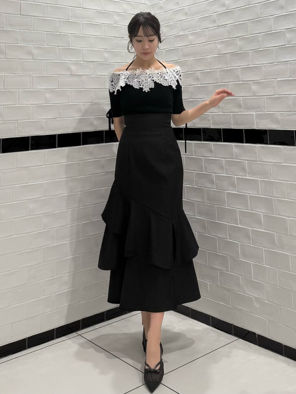 【 トップス 】 レース部分をオフショルにもできるトップスです!首元はクロスにしてもそのままでも○ デコルテラインが綺麗に見えます👀 【 ボトムス 】 dazzlinの名品マイナス5キロシリーズ ✨️ 後ろのレースアップでウエストが調節できて◎ 前にスリットも入っているので歩きやすいです! 【 シューズ 】 ヒール5.5cm と歩きやすいパンプスです✨️ カラーによって素材感も違うのでどれを選んでも可愛い⋆˙⟡ 161cm / 骨格ウェーブ / ブルベ冬 / 23.5cm