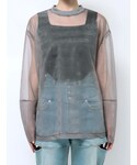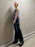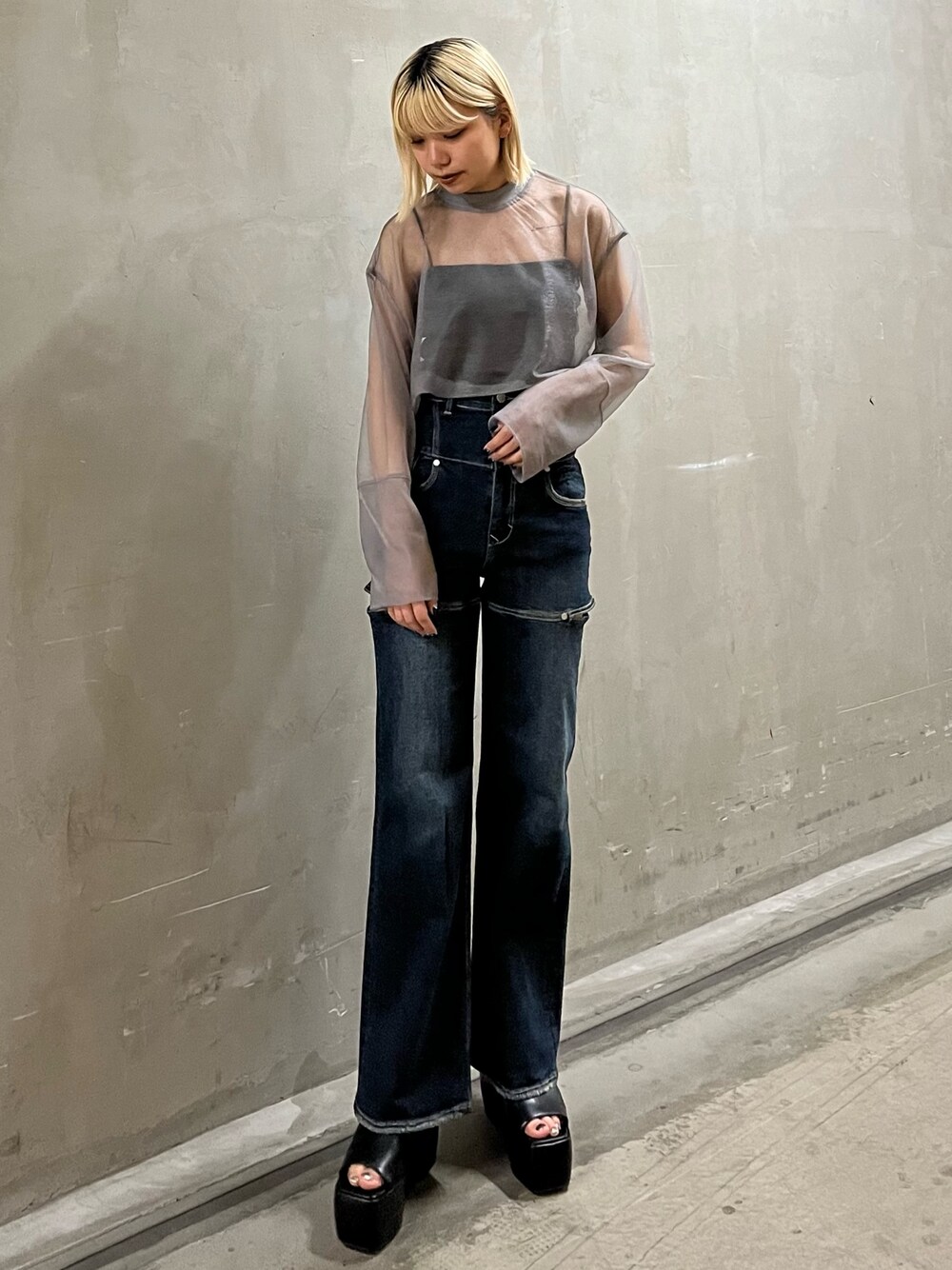 【トップス】 トレンドのシアートップス🩶 光沢感のある素材を使用しているので透け感のあるコーデに仕上がります! 【ボトムス】 カットデザインのハイウエストパンツ💙 デニムなので重たく見えがちですがカット部分の肌見せで重たすぎない印象に! 【シューズ】 高さ9cmの厚底サンダル🖤 傾斜が少なく歩きやすいのはもちろん、アッパー部分にクッション素材を使っているのでソフトな履き心地です!
