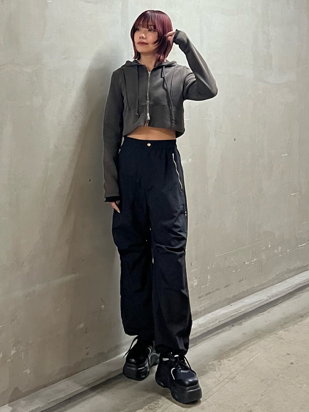 【アウター】 店舗で大人気のショート丈パーカーはハイウエストと合わせてあげたり、冬アウターの中に着てあげたりで使い回しできます! 腕の裾部分にはレースが使われており、レイヤード風でかわいい🖤 【ボトムス】 後ろの裾部分にあるリボンのデザインが特徴的なナイロンパンツ🎀 裾のドローコードで長さも調節が可能なため、小柄な方や厚底を履かない方でも履きやすいです😌♡ 【シューズ】 9.5cmの厚底でスタイルアップ! 軽量で高低差も無いためとても歩きやすいです 24.5cm、Lサイズ着用