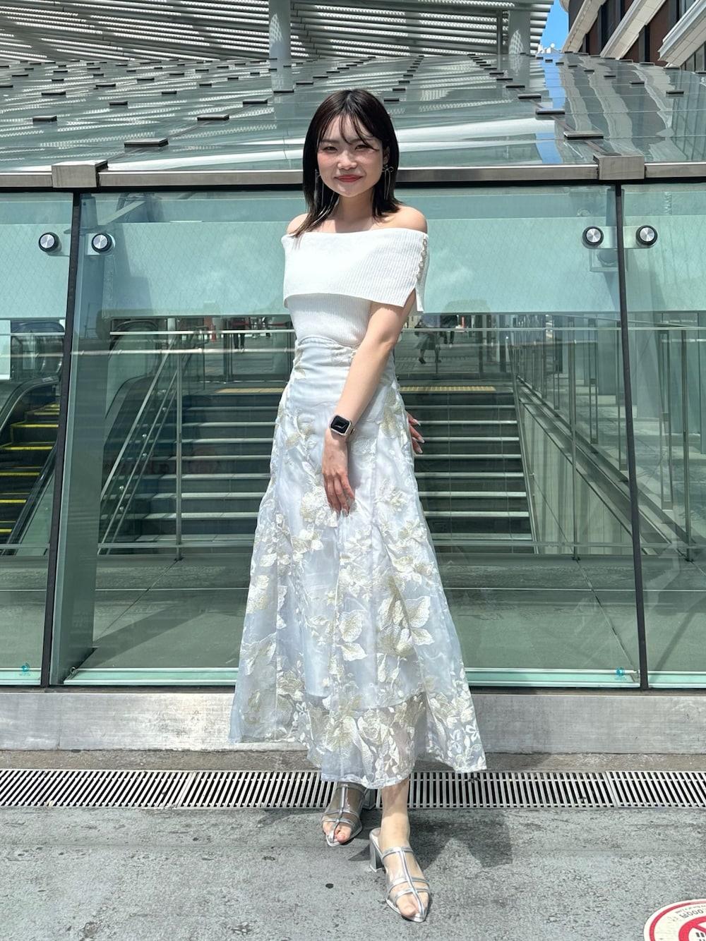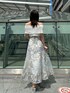 【トップス】 シャリっとラメ感のある素材が夏らしくなっています!オフショルなので鎖骨を綺麗に見せてくれます♡サイドのボタンがシンプルすぎずアクセントになっています♡ 【スカート】 コルセットになっているのでウエストラインが綺麗に出て細見えします♡ふわっと広がるデザインと立体感ある花柄が高級感を演出してくれます♡