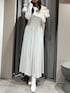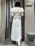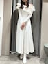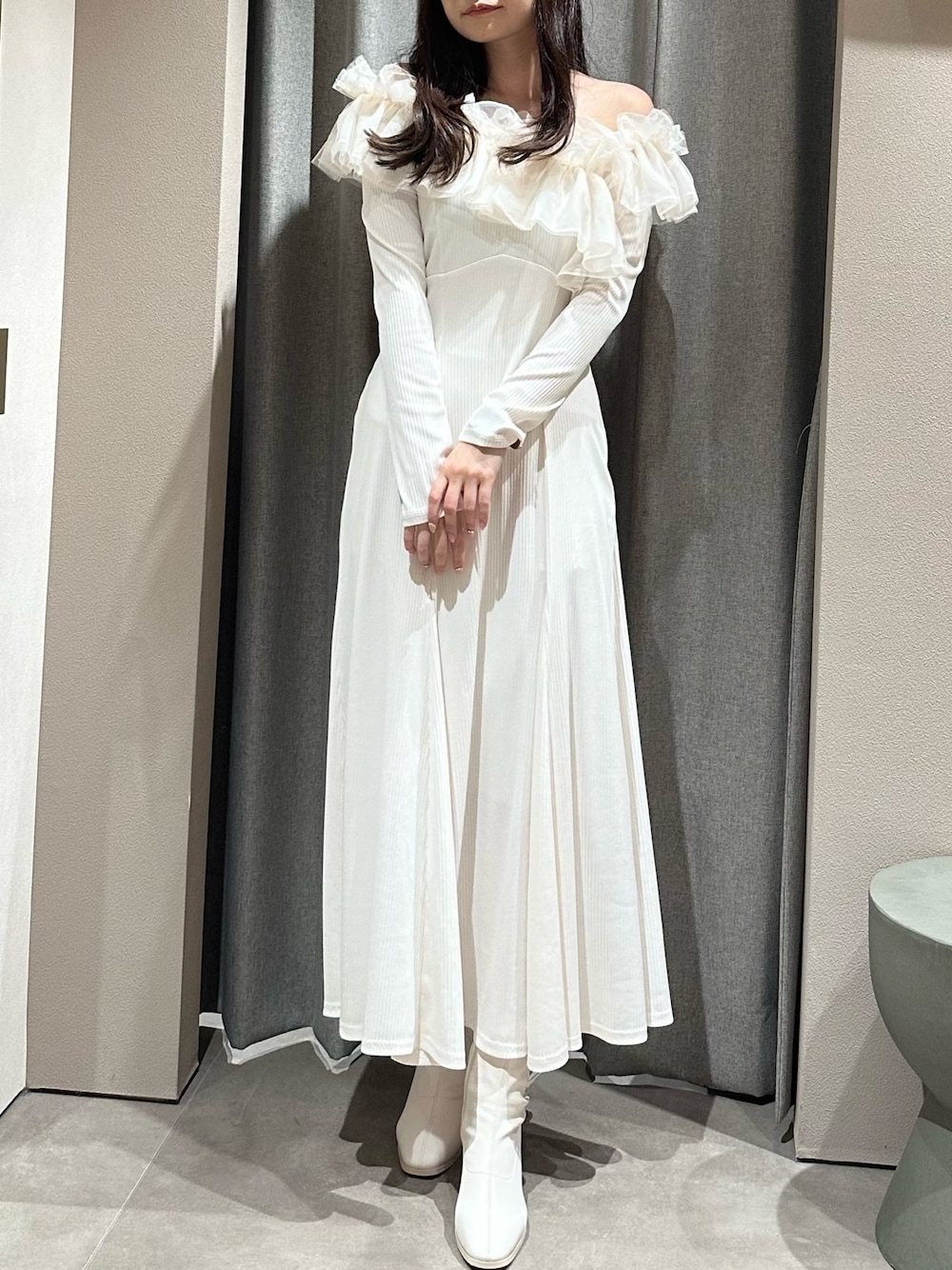 【ワンピース】肩周りのフリルが華やかなワンピースです♡ウエストのリボンを絞っていただくとピタッとしたシルエットになります♡ 【ブーツ】太めのローヒールで歩きやすいです♡
