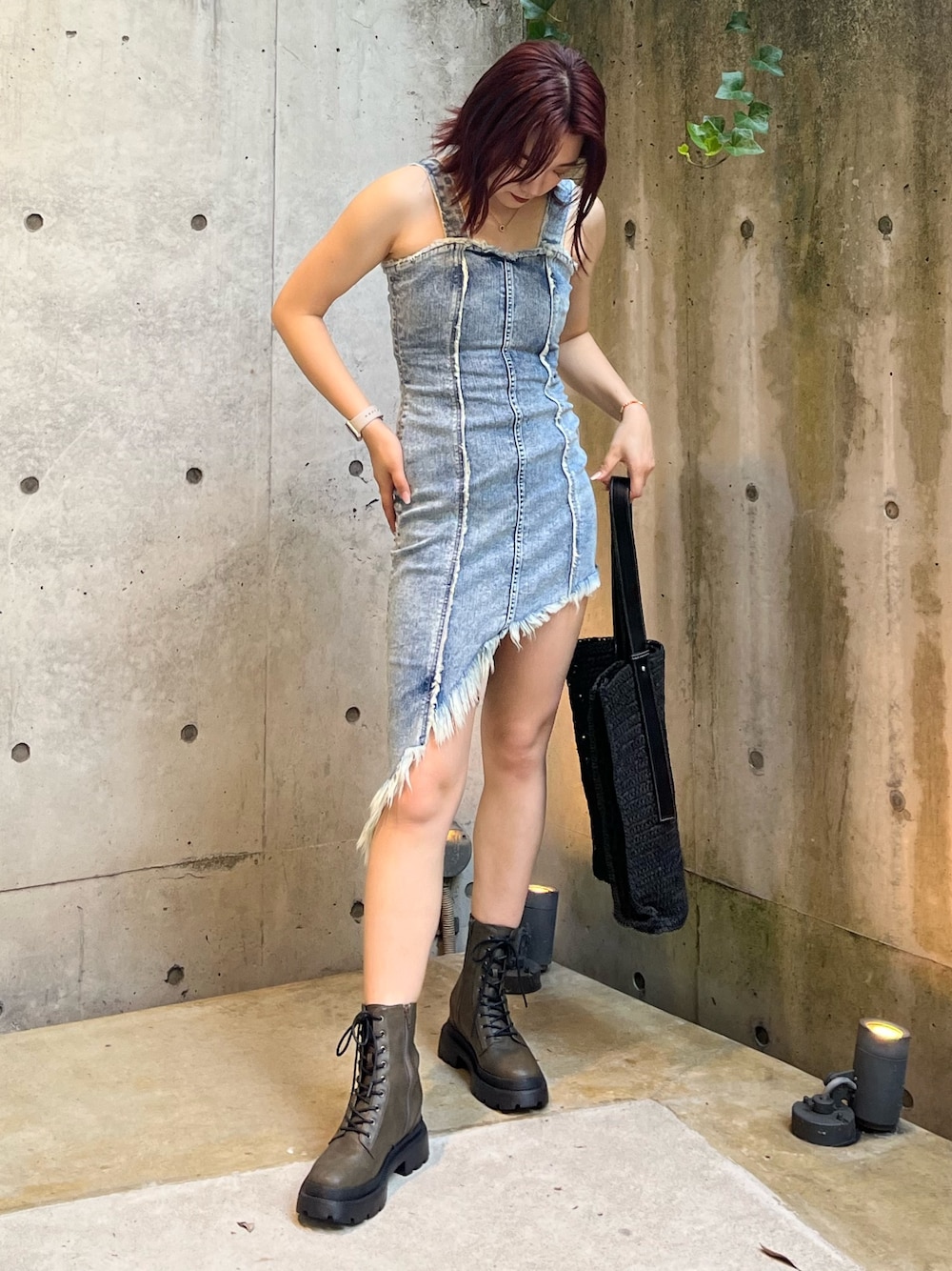 RENA(EVRIS)のワンピース「アシンメトリーフリンジデザインデニムワンピース」を使ったコーディネート