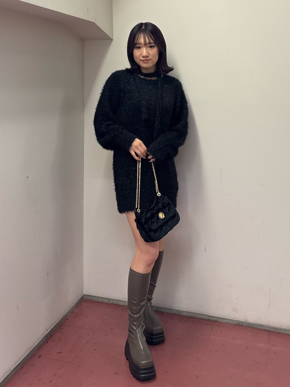 ワンピース:キラキラが可愛いモテワンピ♥️ チョーカー付きで可愛いデートコーデが出来ちゃいます! バッグ:ベロア素材で冬間を演出☃❄ ショルダーでもハンドバックでも使って頂けます! シューズ:普段24.5でLサイズ着用