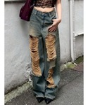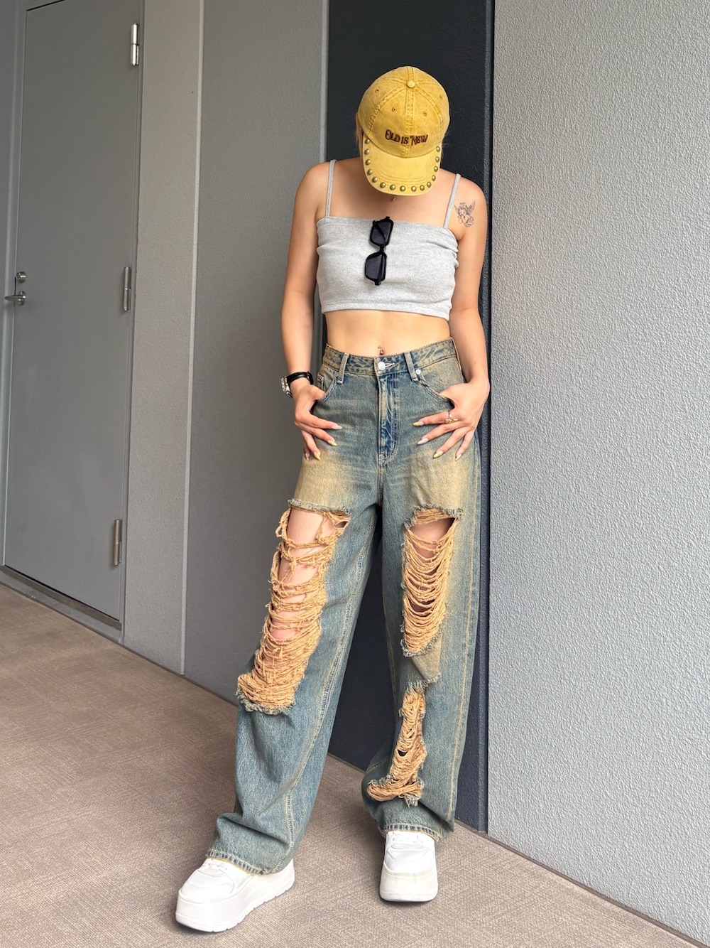 トップス:これはワンピースとセットになってるアイテムのキャミソールです! 形が綺麗なのでデニムとの相性もバッチリです✨ デニム:夏に履きたいダメージデニム✨ ゆるっと海外ガール風に着こなしできるアイテムです!