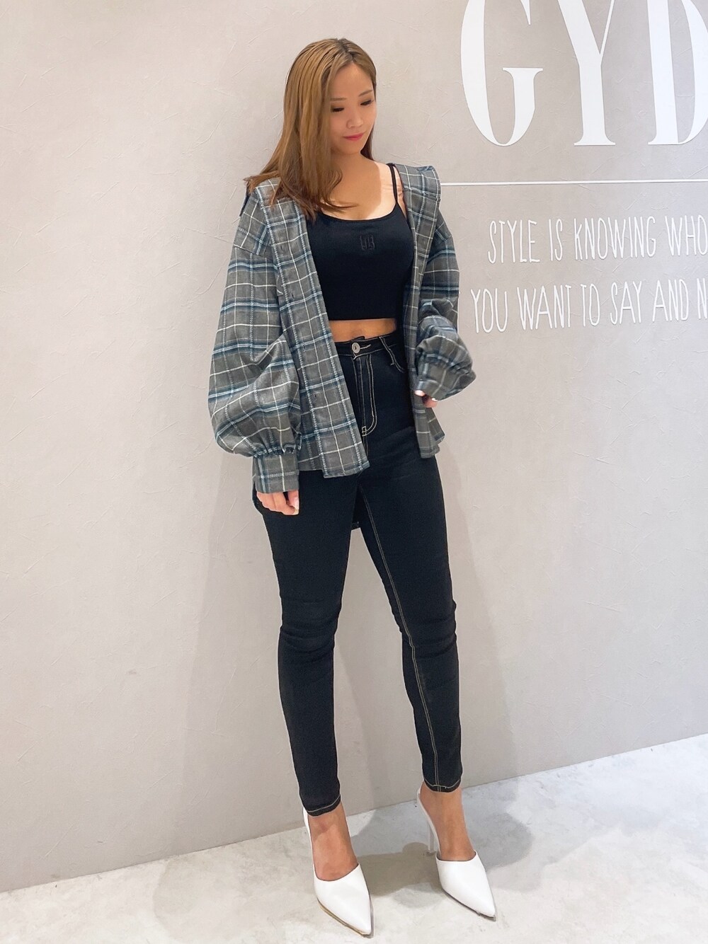《綺麗めカジュアルコーデ》 【Tops】トップスとしてもインナーとしても着ていただけるビスチェは、GYDAの新しいロゴがビスチェと同色で刺繍されており、シンプルで使いやすいアイテムとなっております! 【Pants】ノーダメージのシンプルスキニーは、ストレッチ生地で履き心地バツグンな上、ポケットの位置やステッチデザインが脚を細く長く見せてくれます♪ 150cmでXXSサイズ着用です♡ 【Shirt】これからの季節に大活躍のチェック柄シャツは短すぎず長すぎないミドル丈で使いやすく、肩の位置を落としたデザインなので丸みのあるシルエットでラフさを出してくれます♡ 同じ生地のショートパンツとセットアップで着ていただくのもオススメです! 【Shoes】GYDA定番のミュールはつま先が細く尖ったデザインのポインテッドトゥになっており、スタイリッシュに足をキレイに見せてくれる万能アイテムです♪ 22.5cmでSサイズ着用です♡