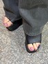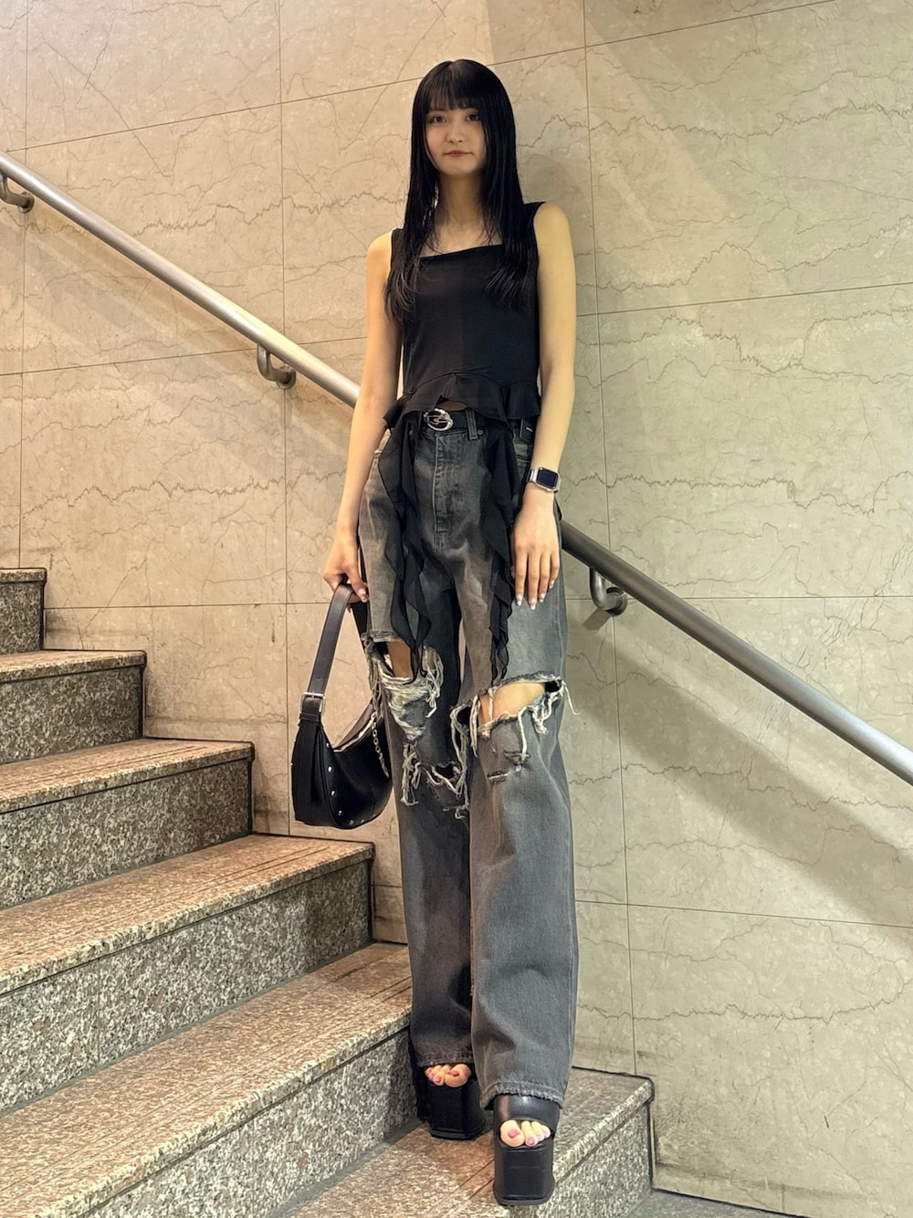 【トップス】トレンドのラッフルデザインがかわいいキャミソール!インナーを変えればオールシーズン使えてコーデのワンポイントに! 【ボトムス】ダメージ具合が大胆で後ろにもダメージが入ってるのは珍しい!ハイウェストなので腰位置盛れちゃいます!横に広がりすぎないストンと下に落ちるタイプなのでシルエット綺麗に見えます! 【シューズ】前にも厚みがしっかりあるため、高低差があまりないないので疲れにくいです!足首の部分に調節可能なベルトが付いているので安定感も抜群です!24.5センチでLサイズでちょうどよかったです!