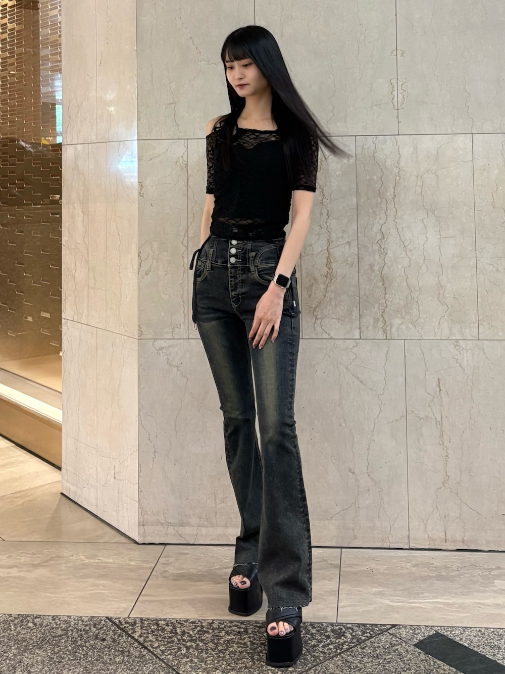 【トップス】ワンショルのデザインがかわいいトップス!カップ付きなのでそのまま着れちゃうのが便利! 【ボトムス】サイドにカットが入ってるデニムでリボンは取り外し可能になってます!ヴィンテージ加工がオシャレ度UPです!ストレッチがとても効いてるので履きやすいです!162センチで2.3センチ以上の厚底と合わせて裾引きずらない丈感でした。 【シューズ】厚底なのに軽くて高低差ないのがすごく歩きやすいです!クロスになってるデザインが可愛い!24.5センチでLサイズ着用してます!