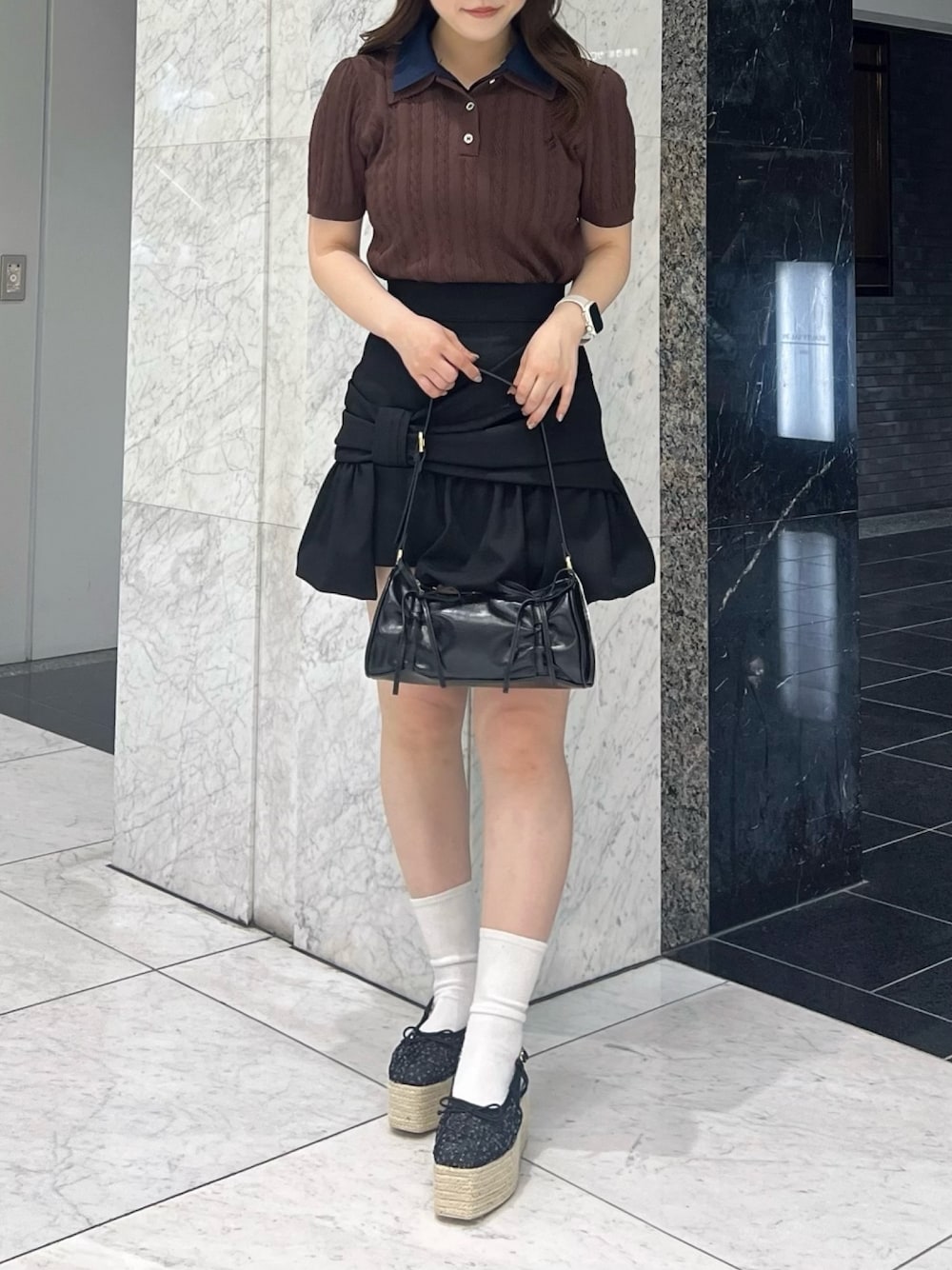 【トップス】 襟のシャツ部分がボタンで取り外し出来るニットトップス♡ ニット素材なのに、薄手で着心地も良いから夏も涼しく着られる1枚です☺︎ 【ボトムス】 大きめのリボンデザインが施されたカジュアルガーリーなミニスカート♡ 裾部分がバルーンシルエットになっているから身体のラインを拾いすぎずに履けちゃうよ☺︎ 152cmでSサイズ着用してます♫ 【バッグ】 ギャザーデザインがこなれ感を出してくれるトレンドバッグ♡ リボンも可愛すぎず、バッグと同素材の細めのリボンなのでカジュアル系やフェミニン系などどんなコーデにも+αしやすいよ☺︎ 【シューズ】 バレエシューズの可愛さと夏らしい厚底デザインが相性抜群なサンダル♡ ヒール普段履かない方も厚底なので履きやすいアイテムです☺︎ 22.5cm〜23.0cmでMサイズがちょうど良かったです♫