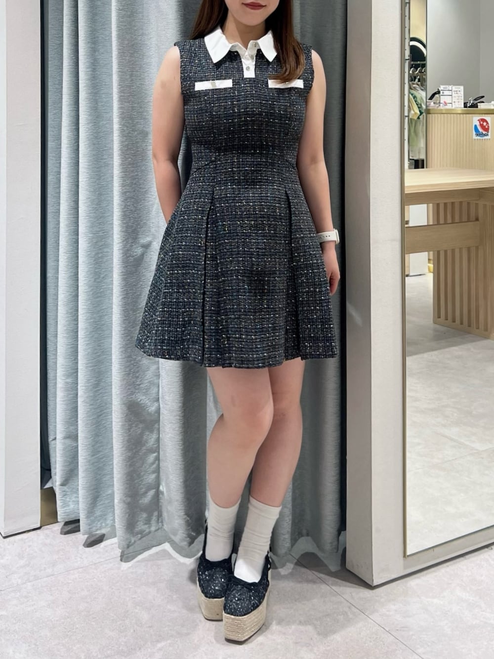 【ワンピース】 襟付きデザインで高見えする大人ガーリーワンピース♡ バックファスナーでウエストマークしてくれて、フレアシルエットで下半身をカバーしてくれるスタイルアップワンピースです☺︎ ロングブーツと合わせても可愛いよ♡ 152cmでSサイズ着用してます♫ 【シューズ】 バレエシューズの可愛さと夏らしい厚底デザインが相性抜群なサンダル♡ ヒール普段履かない方も厚底なので履きやすいアイテムです☺︎ 22.5cm〜23.0cmでMサイズがちょうど良かったです♫