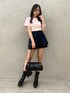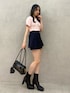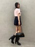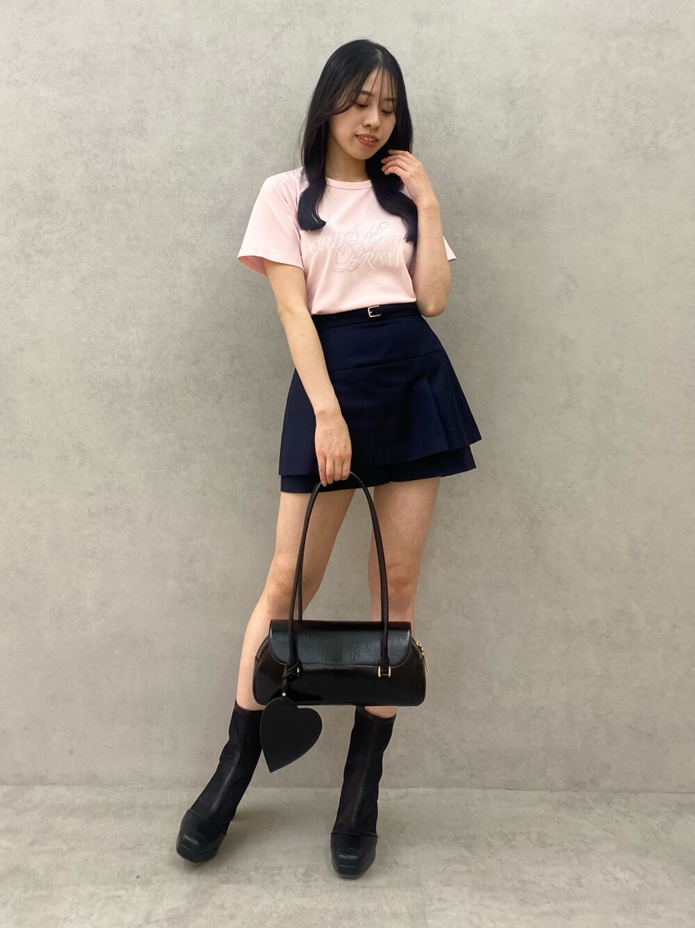 【Tシャツ】 シンプルデザインなのでボトムス合わせの幅が広がり着回ししやすいアイテムです✨ 【ボトムス】 ミニ丈ですっきりとした形なので足長効果とトップスインするとベルトが見えてメリハリがつきます!