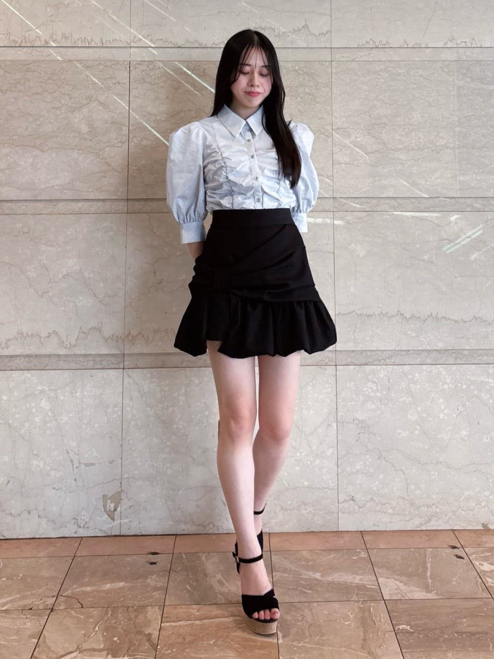 【トップス】 フィット感ある着痩せシャツ! 裾のサイドに紐がついてるのできゅっと結んで長さ調節できます! 【スカート】 大きいリボンが特徴のミニスカート ちらっと短い部分があるので大人っぽい印象に見せます。