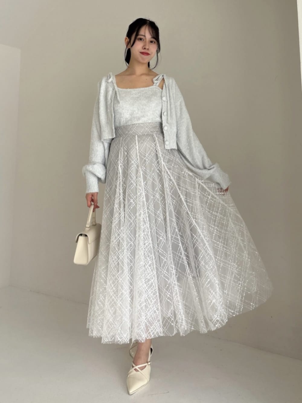 【カーディガン】 キラキラしたデザインですが痛くないので着心地もいいです! ショート丈なのですっきり着たい時におすすめです! 【キャミ】 カーディガンと合わせて着回しできるのと夏の時期は一枚できても大丈夫です! 【スカート】 スパンコールでキラキラとしたデザインとチュールが何枚も重なってるのでふわっとしたシルエットになります! 【シューズ】 Mサイズ着用 ヒールが高過ぎないのとフィット感があるので歩きやすいです!
