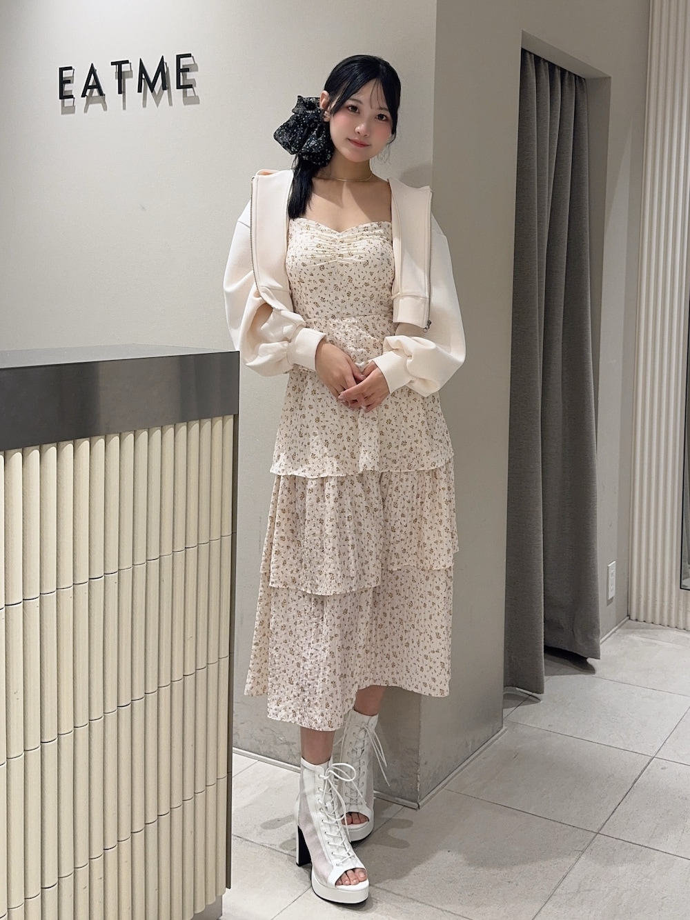 【ワンピース】骨格ウェーブさん優勝のワンピース✨️柔らかい生地と小花柄が春らしくて可愛い🤍🌷切り替え位置の高いティアードフレアシルエットが腰周りを自然とカバーしてくれてスタイルアップ効果も抜群🤍パット付きでそのまま着られるのも楽ちんで嬉しいポイント🫶🏻 お羽織によって今から夏までしっかりお使いいただけます🩰ᩚ 169cmの私がSサイズを着てふくらはぎ半分より下くらいの丈感です🎀ིྀ 【パーカー】着心地抜群のショートパーカー✨️モチモチのボンディング生地がお手入れも楽ちんです🫧ྀི小さなロゴ刺繍もさりげなく可愛い🎀ིྀ🤍セットアップのパンツとはもちろん短めの丈感でワンピースとも相性バツグンです♡♡ 【ネックレス】オーロラストーンのネックレス💎シンプルながら華やかに輝くストーンが上品で可愛い♡短めのチェーンで首やデコルテを綺麗に見せてくれます✨️ 【シューズ】マイナス5キロ見えのブーツサンダル👢🎀13cmのヒールを感じさせない高低差の無い履き心地が1日はいていても疲れにくくて嬉しい🥹細かいレースアップデザインも大人可愛くて店頭でも大人気です🤍シューズサイズ25cmの私はLサイズを着用しております✨️ 【ヘアクリップ】大きめおリボンのヘアクリップ🎀小さなクリップがヘアゴムをピンポイントでキャッチしてくれるので簡単にヘアスタイルを華やかにしてくれます✨️柔らかめの生地も抜け感あって大人かわいい♡♡