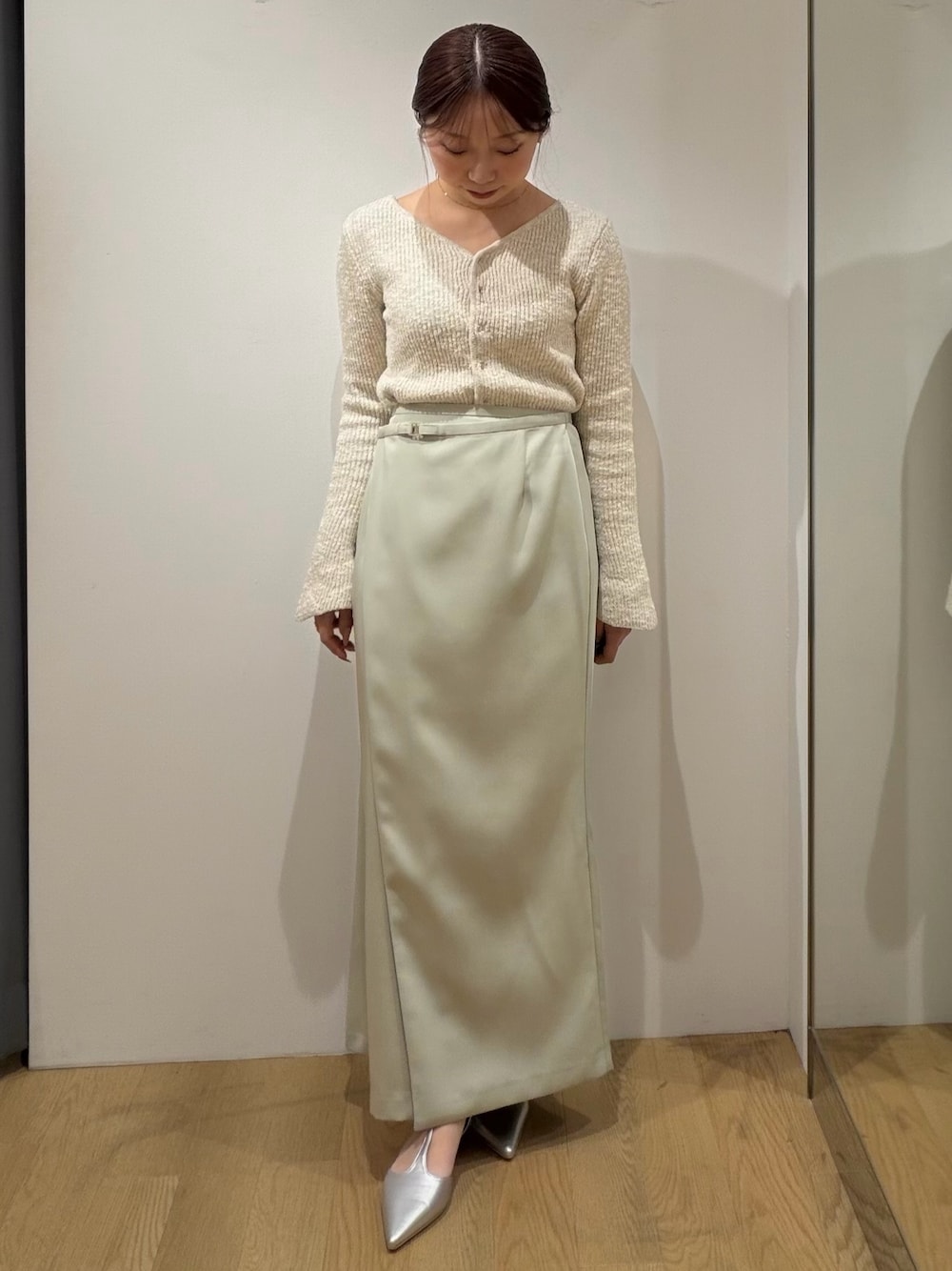 《tops》さりげないラメが可愛いゴールドボタンニット 首元も空きすぎずフレアの袖で二の腕の細見え効果もあります✨ キレイめにもカジュアルにもお使いいただけます! 《skirt》少し厚手のサテン生地なのでボディラインを拾わず足を綺麗に見せてくれます! 骨格ウェーブですが腰周りもピタッとせず楽に着用していただけます! ヒールを履けば小柄さんでも丈問題なしです◎ 152cm/Sサイズ