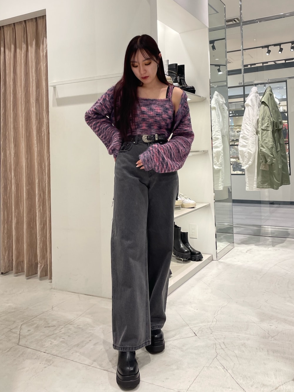 『tops』フェザーのラメアンサンブル^ ^ ビスチェはインナーとしても使えて、カーディガンは羽織としても使えて個々で活躍できます🫶🏻 『denim』後ろにダメージの入ったデザインのデニムパンツ^ ^ポケットの位置とダメージの位置が高めに作られているので脚長効果抜群🙆♀️