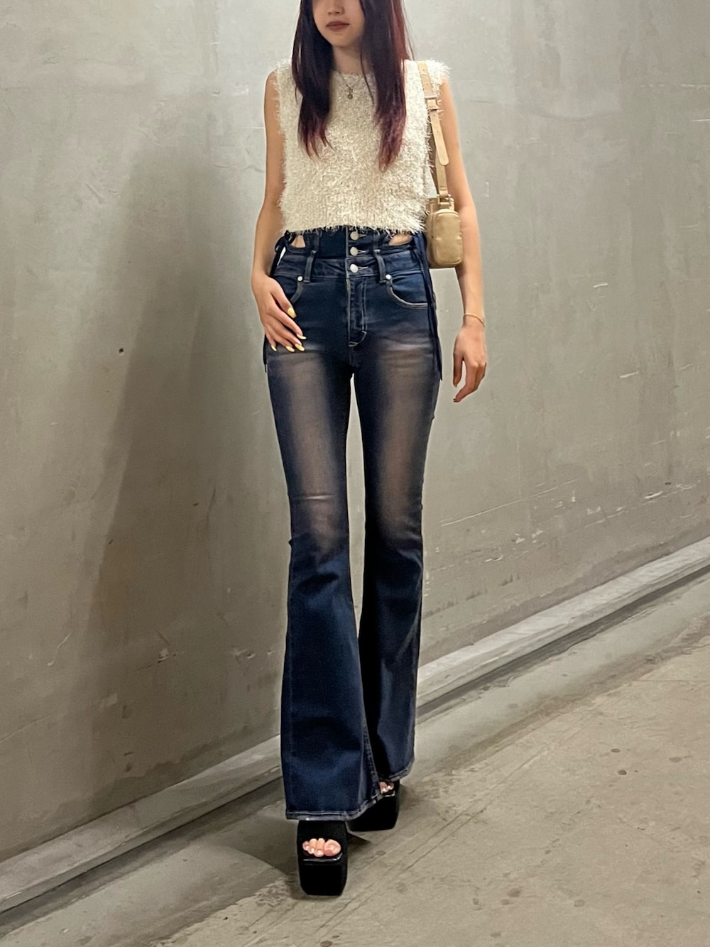 キレイめコーデ♡ 【tops】 さり気ないラメ感で今季らしさを取り入れられるアイテム✨ 【denim】 サイドのカットとリボンディテールがポイントのハイウエストデニム💙 【shoes】 ヒールがフレアな曲線デザインになっているので見た目にも女性らしい印象に🖤 普段24.0-24.5cm着用 【bag】 スエードの素材で秋らしさを取り入れた季節先取りアイテム👜