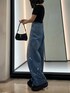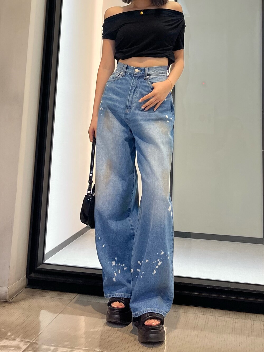 【tops】 伸縮性があるので、さらっとした着心地ながら女性らしさを感じられるデザインなので上品な着こなしに🖤 【denim】 ビンテージ風の加工やペンキを飛ばしたようなデザインがポイントのルーズジーンズ🎨 身長162cmでSサイズ着用 【sandal】 側面にエッジを効かせたフォルムのソールを使用しているので、モードな雰囲気で履いていただけるデザインに👡 普段24.5cm着用 【bag】 存在感のあるフロントロゴデザインが持つだけでポイントに🪐