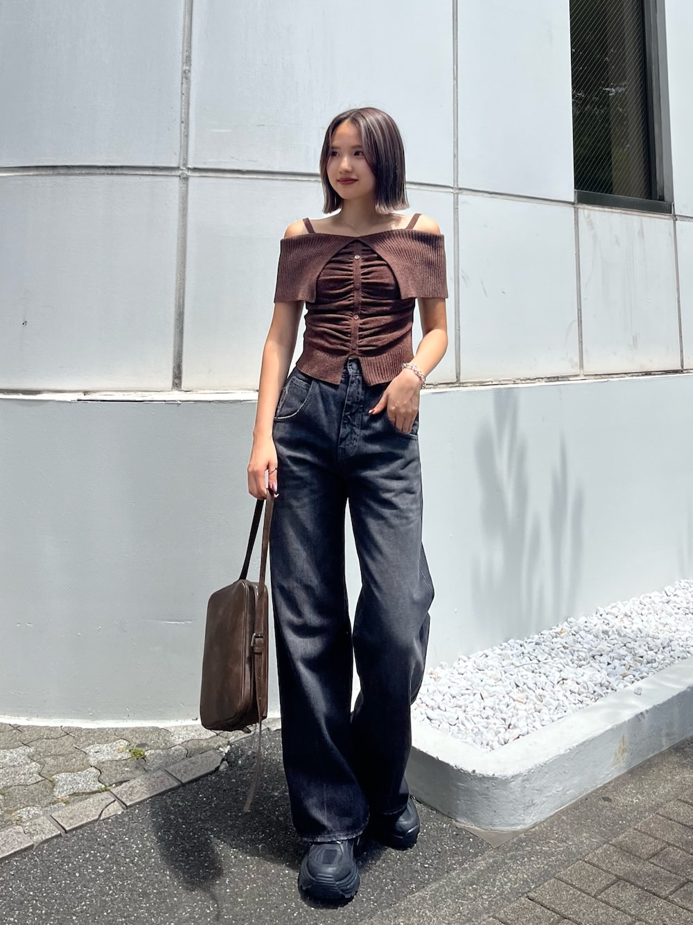 李 相美(EMODA)のニット/セーター「フロントボタンオフショルダーニット」を使ったコーディネート