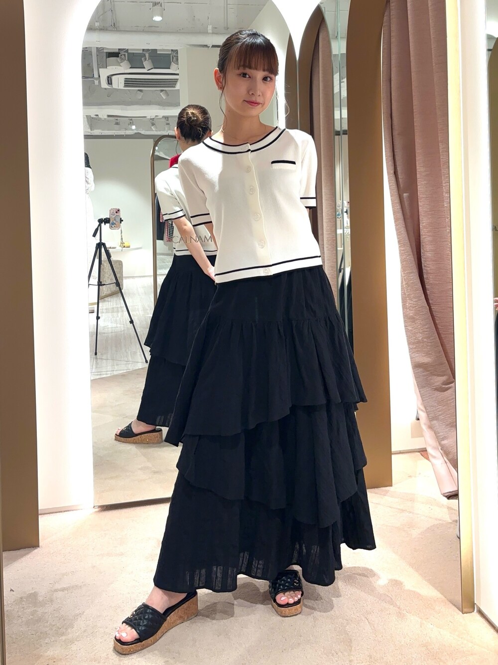 モノトーンコーデ🤍🖤 トップスのカーディガンはコンパクトなシルエットでキレイめに着られます.ᐟ.ᐟ おへそくらいの丈感なのでロングスカートにもパンツにも合わせられる万能トップスです◎ キャミワンピの上に羽織ってあげても◎ スカートは夏にぴったりな綿素材でシンプルなのでどんなトップスも可愛く映えます♪