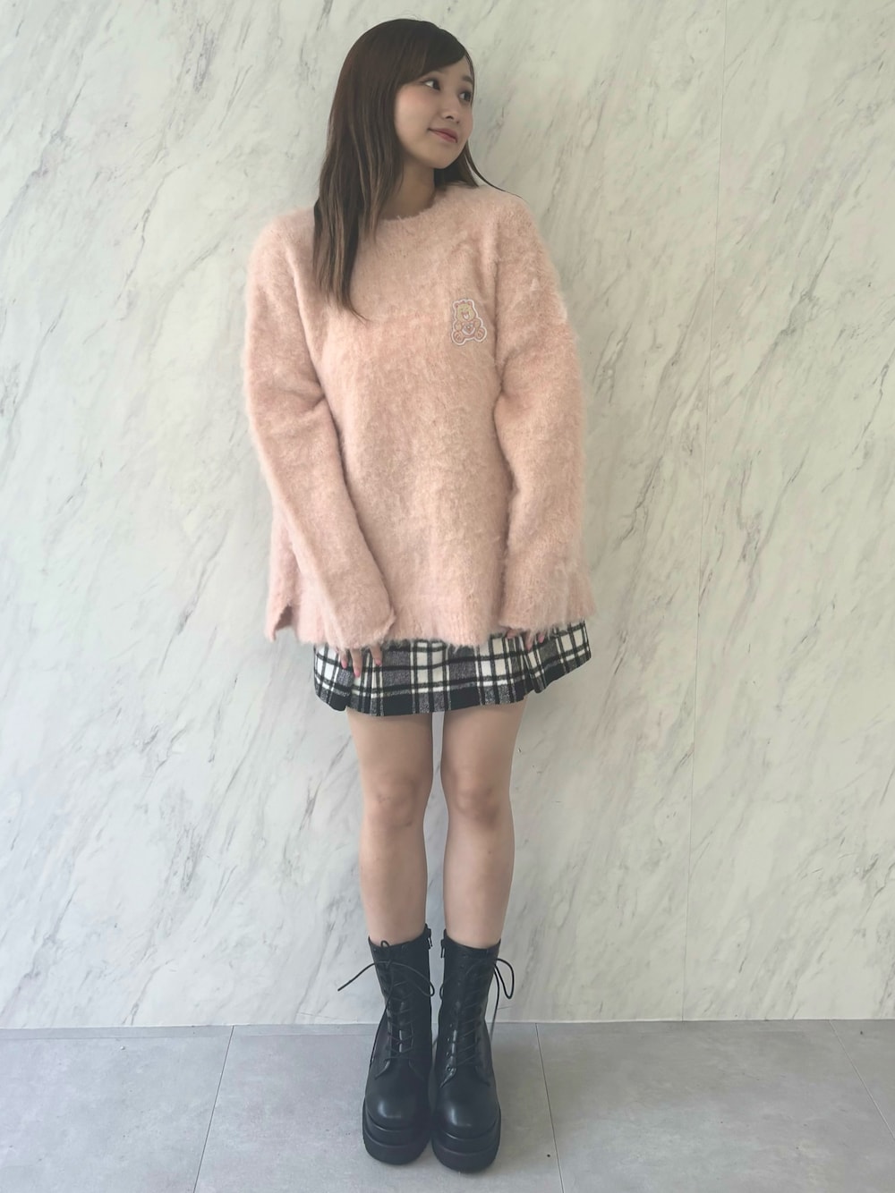 ☁️💘CALNAMUR×Care Bears💘☁️ ケアベアコラボのオーバーサイズニットです♡ 胸元にはカラーごとにケアベアのワッペンが施されています🧸 ヒップまで隠れる丈感でミニ丈と合わせてワンピ風に着るのが個人的におすすめです◎ 男性の方でもお召しいただからサイズ感です.ᐟ.ᐟ カラーは淡いピンクに近いアイボリーで柔らかいふんわりとした印象になります☁️ スカートのチラッと見えるチェック柄もとっても可愛い♡ ブーツは普段23cmでSサイズ着用しており、厚底でスタイルアップ効果抜群ですദ്ദി₍ᐢ. ̫.ᐢ₎