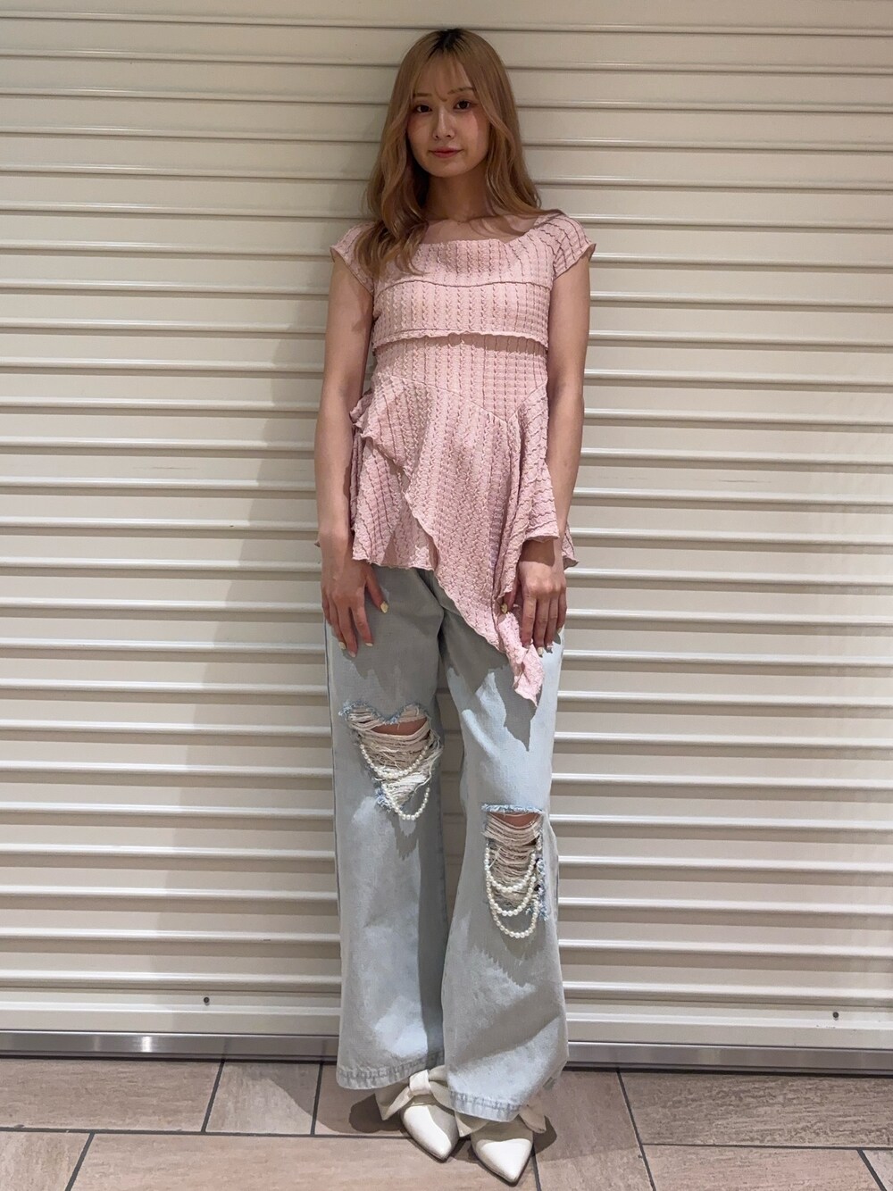 トップスはアシメデザインで1枚着るだけで一気におしゃれ上級者に🪄︎︎ さらっとした生地感で夏はもちろん、秋口にも着られるくすみ系のカラー🫶 オフショルダーにしてもご着用いただけます🙆♀️ ボトムスはダメージとパールが可愛いデニムパンツ👖 身長155cmでSサイズを着用しております! 右側のダメージはハートのシルエットになっており普通のダメージで終わらせないのがカルナらしいෆ ̫ ෆ 靴は普段23cmでSサイズを着用しています!