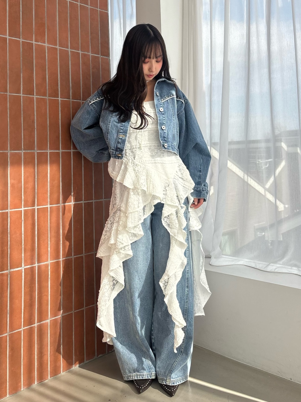 昨年大人気だったアシンメトリーヘムワンピースがパワーアップして登場💫 今年はチョーカー付き🌹去年のものよりも丈感が短めになって155cmの私も引きずらずに着用できました🙆♀️レース感が去年より増してよりフェミニンな印象に໒꒱· ゚ 春に合わせるのがおすすめなデニムジャケットは丈が短めでワンピ合わせもばっちり👌´- デニムはサンプルでMサイズを着用しています! 靴もサンプルでLサイズです!