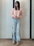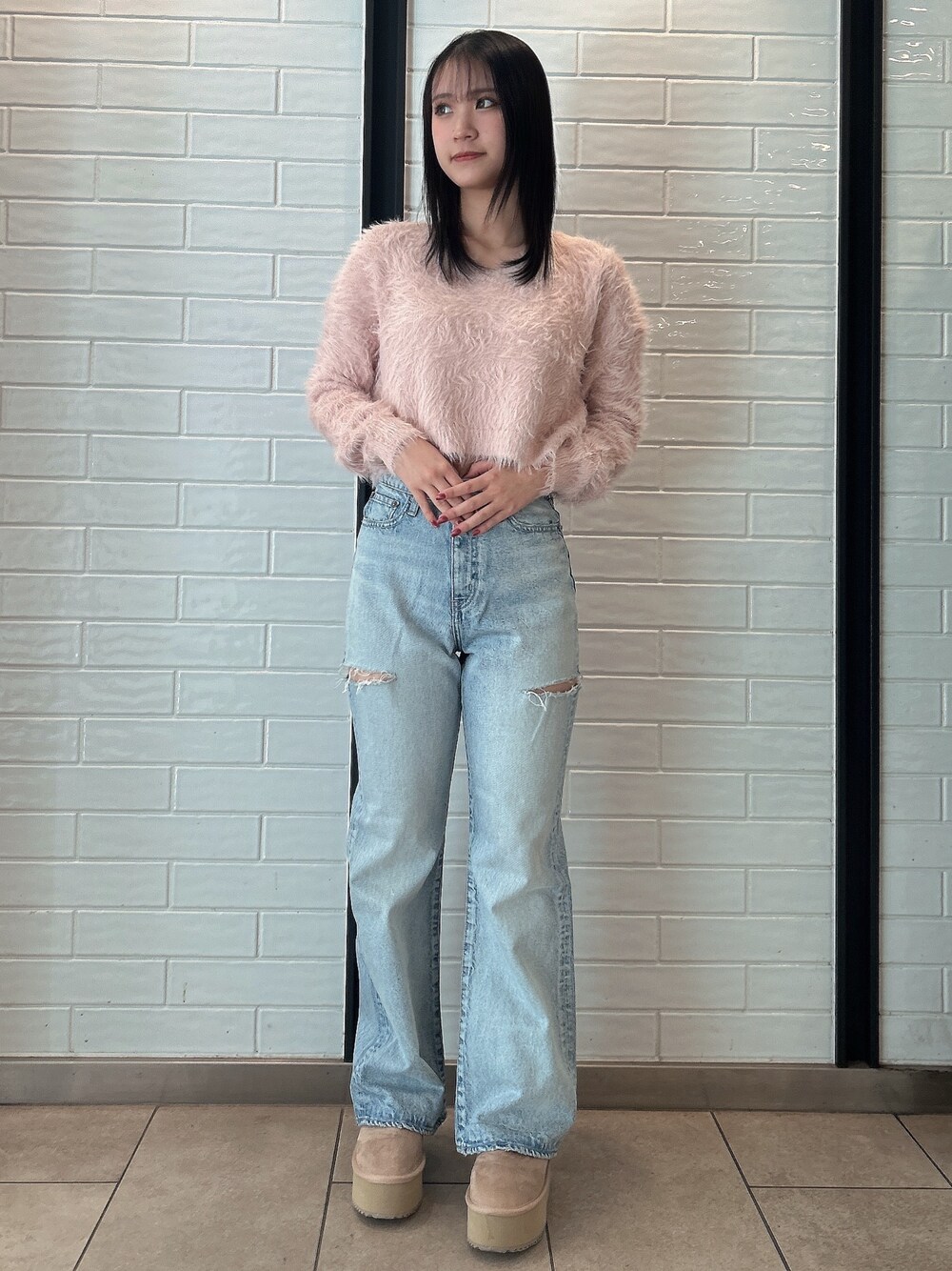 カジュアルコーデ 【トップス】 シャギー素材のニットトップス🧶 肌触りがよく着心地がとてもいいです! ショート丈なのでボトムスを迷わずたくさん着回しができます♡ 【デニム】 ハイウエストデザインのワイドパンツなので安心して着用できます! 脚長効果も期待できるデニムです!♡ サイドのダメージデザインもすごく可愛いです🩶 160cm Sサイズ着用 【シューズ】 大人気のムートンブーツ! すごく軽く長時間履いてても痛くならないデザインです! 色味も可愛くとても人気です。 160cm Mサイズ着用