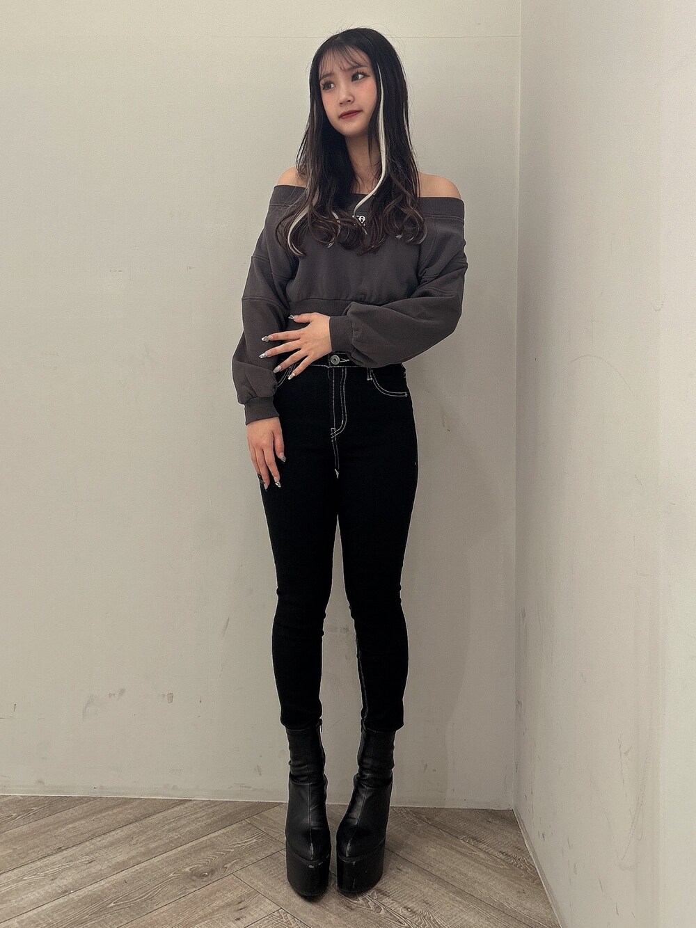 カジュアルコーデ 【トップス】 大人気のGYGYロゴプレートがあるオフショルショートトップスです♡ シンプルで肌見せが楽しめるトップスです。 ショート丈なのでハイウエストのボトムスと相性が合います! 【デニム】 GYDA定番のワンウォッシュスキニーです。 ストレッチがすごく効いてて普段使いもしやすいシンプルなデザインです。 締め付けてくれるので美脚効果も抜群です♡ 161cm XSサイズ 【シューズ】 毎年人気のシンプルな厚底ブーツです。 どんなコーデにも合わせやすく厚底なので安定感もあります♡ 161cm Mサイズ