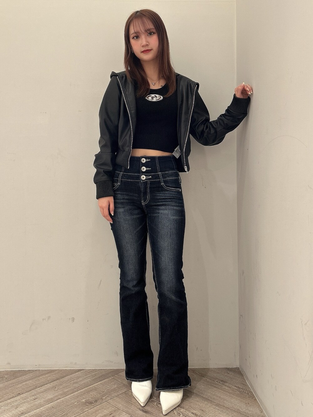 【トップス】 キラキラストーンで埋め尽くされたGDロゴがポイント✨ クルーネックで首元が綺麗に見えます。 薄めのニットなのでアウターも羽織りやすいです。 【アウター】 柔らかいレザー素材のフード付きアウター 左胸あたりにsymmetryのロゴがありシンプルすぎないデザインです。 ショート丈なので使い回しできます♡ 【ボトムス】 大人気のウエストクロスシリーズのフレアデニムです! 程よいフレアの形なので脚長効果抜群で足の形も綺麗に見せてくれます♪ 161cm Sサイズ 【シューズ】 大人気のポインテッドミュールが高低差と安定感がアップして登場しました! シンプルなのでどんなコーデにも合わせれます! 23.5cm Mサイズ