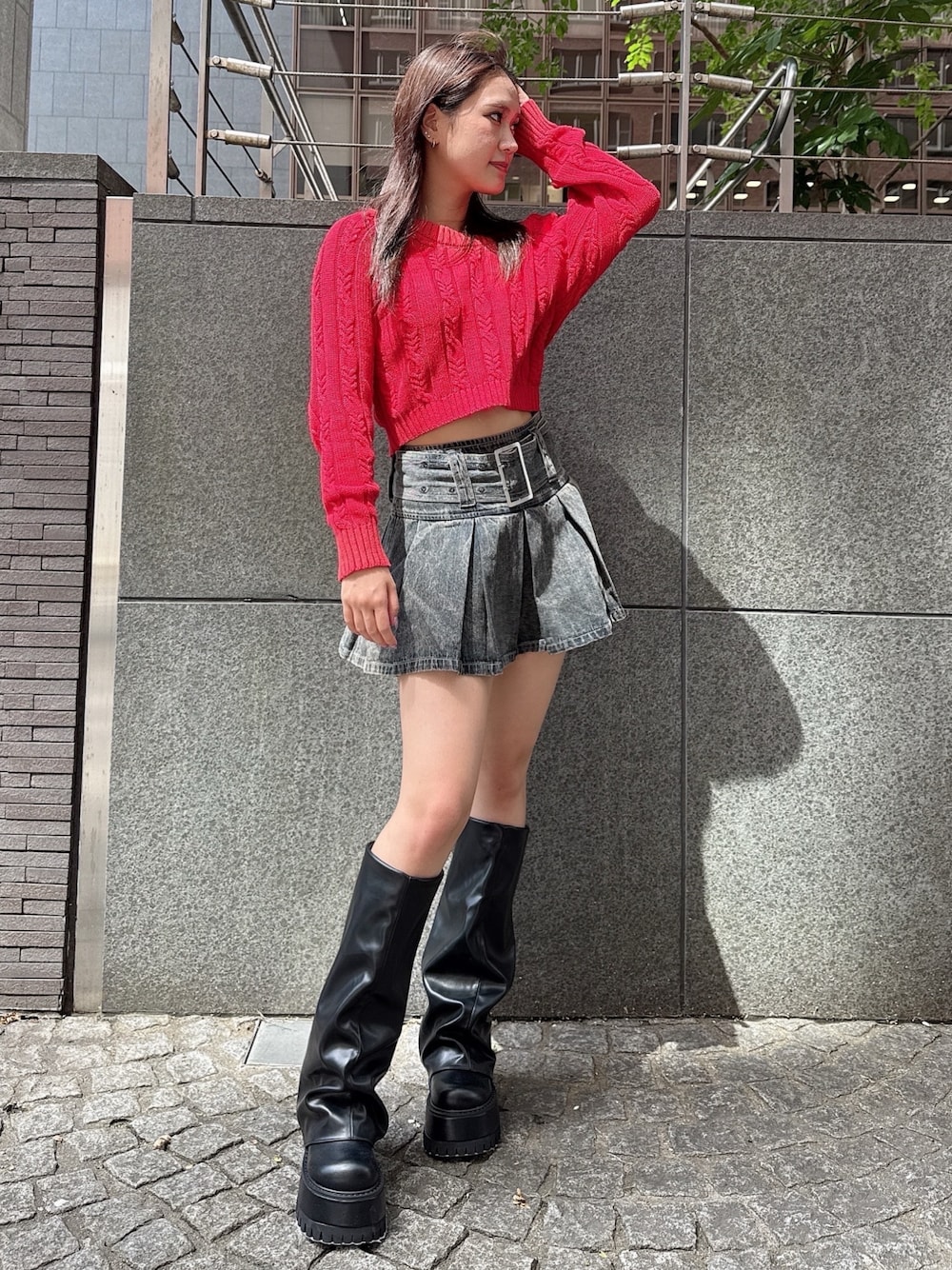 【トップス】 袖口と襟周りに加工があり存在感を出してくれるニットトップスです🧶 オフショルにしてもワンショルにしても可愛い❗️ 【スカート】 取り外し可能のベルトがついたスカートです。 左側にファスナーがあり着脱もしやすいです♪ 161cm Mサイズ 【シューズ】 ボリューム感のあるブーツ👢 厚底なので身長も盛れるし細見え効果も✨ 23.5cm Mサイズ