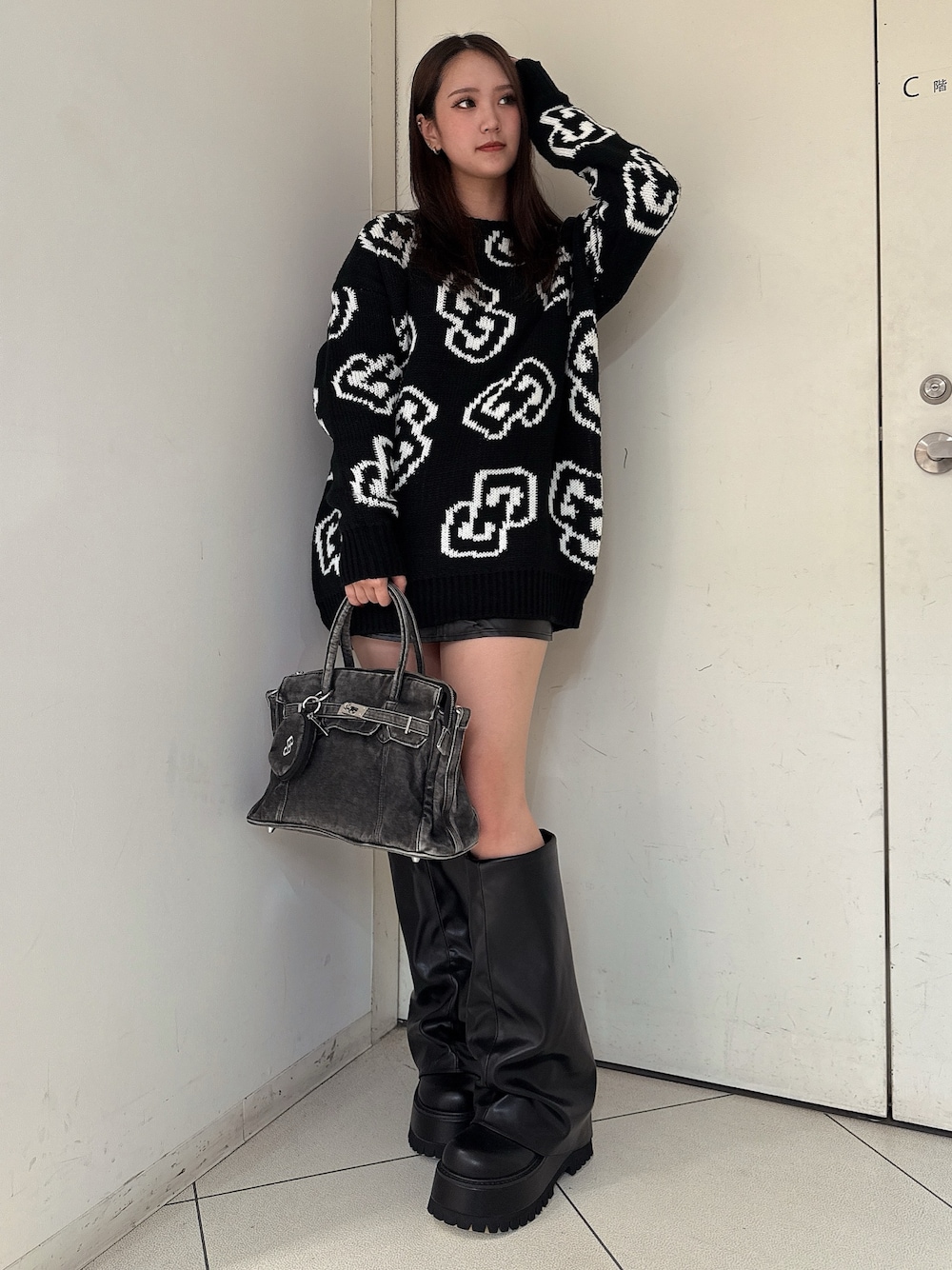 【トップス】 全体にGGのロゴがアクセントになってるニットトップス🧶 ルーズシルエットなのでデニム合わせでも、スカート合わせでワンピース風に着用しても可愛い♡ 【スカート】 毎年人気のレザースカート 短すぎず長すぎずですごく使いやすいアイテム! インナーも入ってるので安心して着用できる♡ 【シューズ】 ボリュームが感のあるブーツ👢 厚底なので身長も盛れるし細見え効果も✨ 23.5cm Mサイズ
