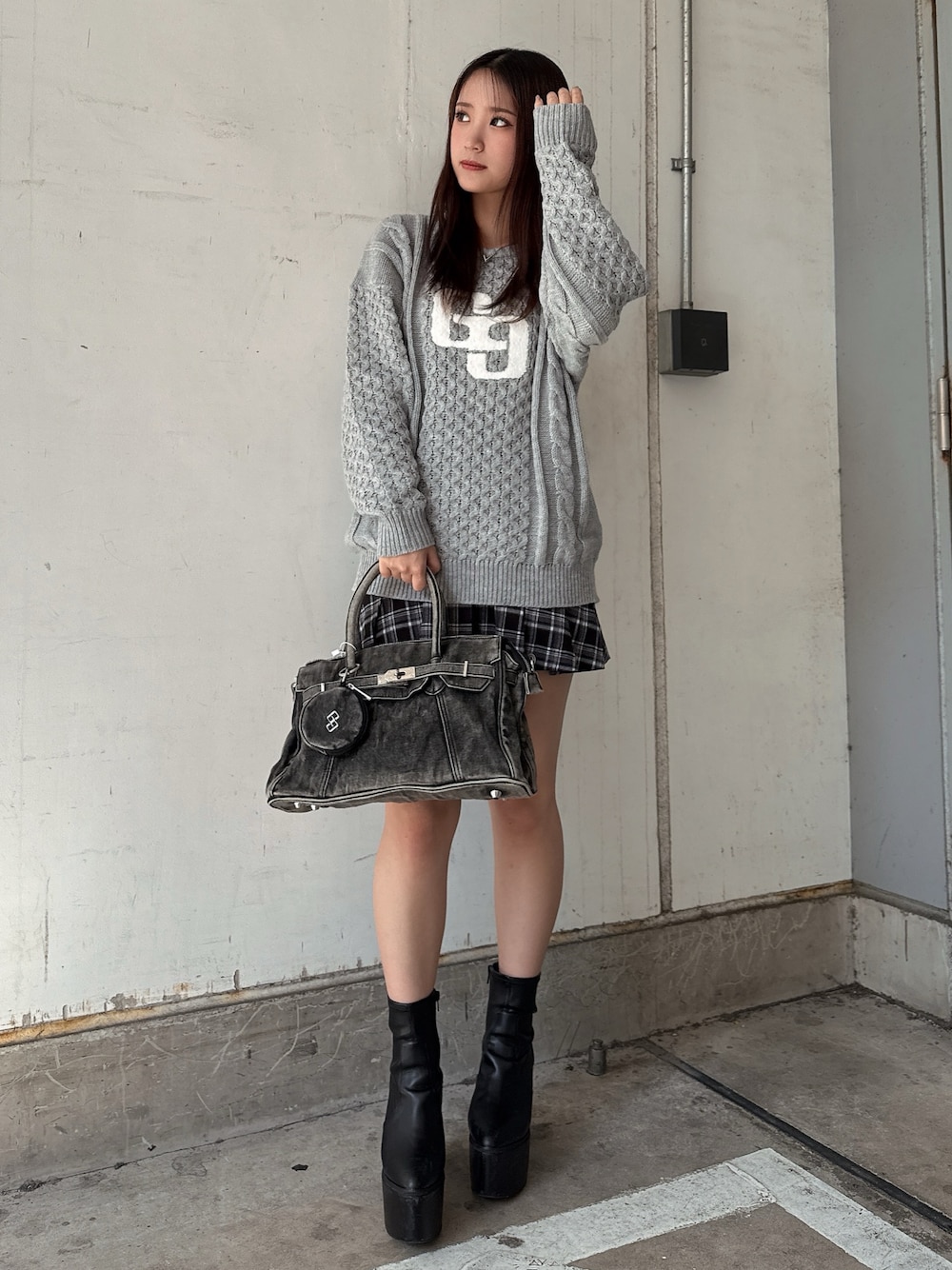 【トップス】 オーバーサイズのニットトップス🧶 真ん中のGGロゴがシンプルすぎず 一枚でも主役になれるトップスです♡ 【スカート】 ベルト付きのプリーツスカートです! インナー付きなので安心して着用できます❤︎ カラーも秋冬っぽくて可愛いです🖤 【シューズ】 毎年人気の厚底ブーツです! ヒールが高いですが前と後ろに高低差がなく 安定感があります。 脚長効果と細見え効果が期待できます! 23.5cm Mサイズ