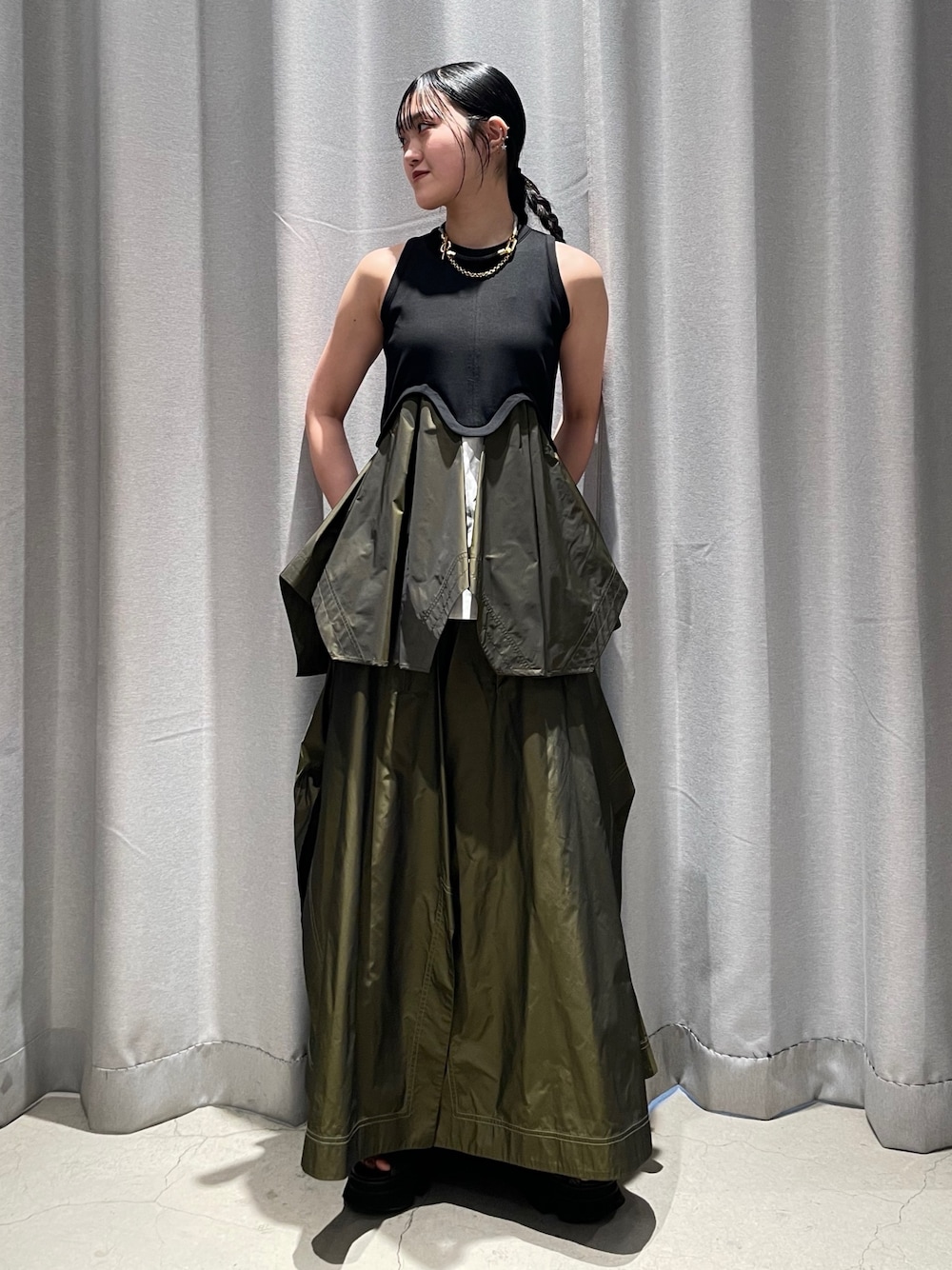 【トップス】 ウェーブカッティングの身頃から、ボリューミーなイレギュラーヘムがポイントのタンクトップ。 ヘム部分は何枚も重なっているように見える構築的なパターン。 胸周りは伸縮性に優れており、着心地◎ パンツスタイルとも相性抜群です。 【スカート】 トップスとセットアップでご着用いただけるスカート。 ボリューミーイレギュラーヘムがポイント 足回りはスリットが大きく入っており、動きやすさも◎モード感満載の1枚です