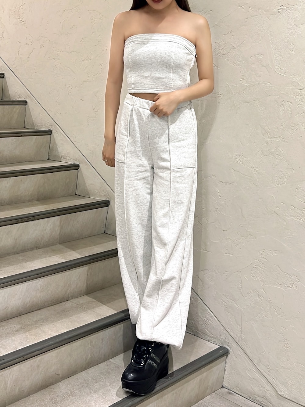 楽に着られるけど、ダル着見えしない、ベアトップタイプのスウェットセットアップ♪ ベアトップは後ろがしっかりゴム入っているので、落ちてくる心配もナシ! スウェットは下に溜まる感じがまた可愛い🫧 スニーカーはもちろん、サンダルで合わせても可愛い💭