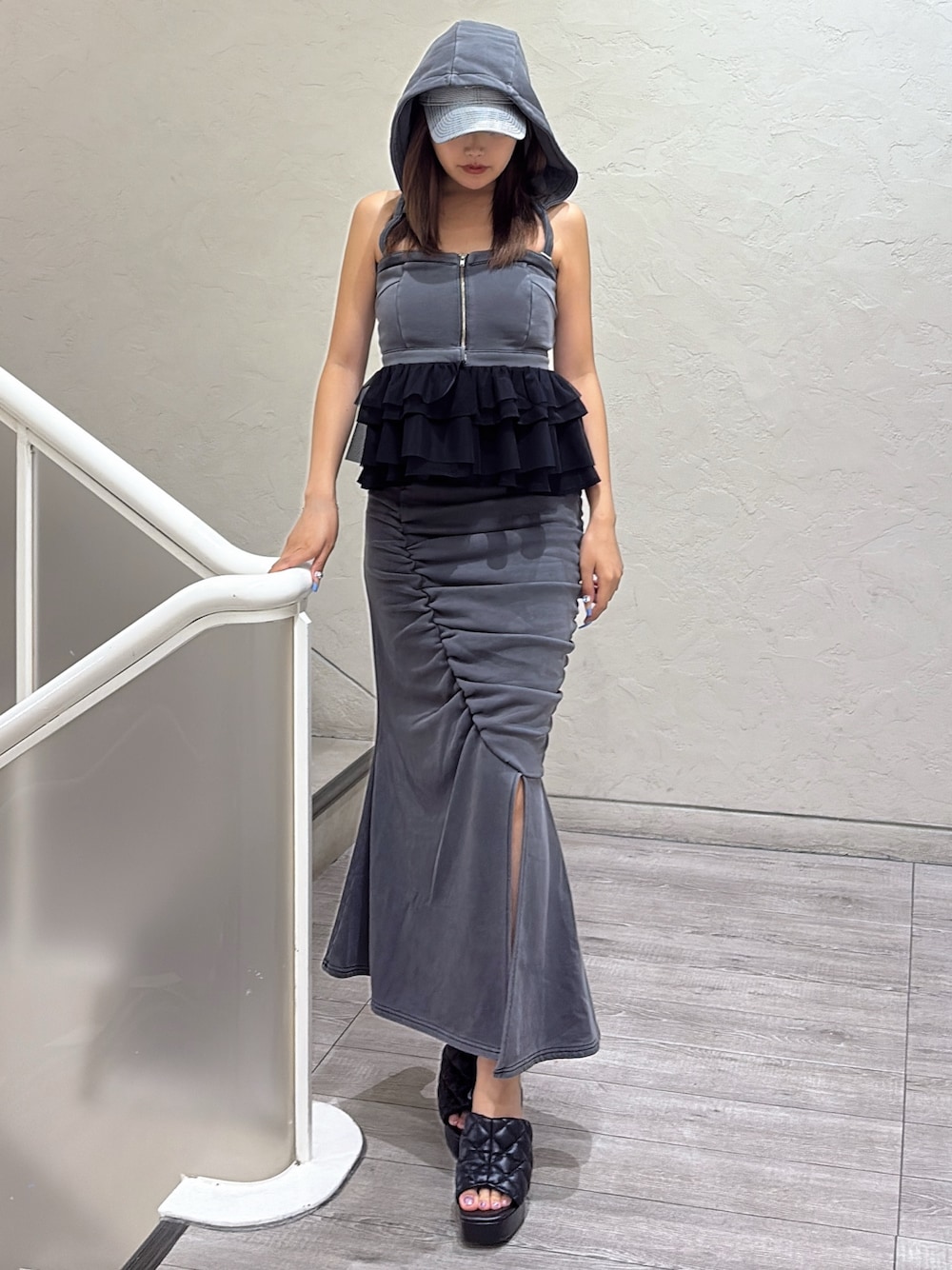 上下別々でも使えるおしゃれすぎるセットアップ✨ トップスはフードと甘すぎないフリルがついていて、フードを被ると背中が見えるのもポイントです♪ スカートはギャザーの寄っているマーメイドシルエットで、やりすぎ感のないスリットで重たく見えません! サンダルはフリルのブラックと統一して、キルティングデザインの厚底サンダル👡 ふわふわな触り心地で靴擦れの心配ナシ🙅♀️ 踵が空いているデザインで横幅も大きめなため足が大きめの方でも安心して履けます💭