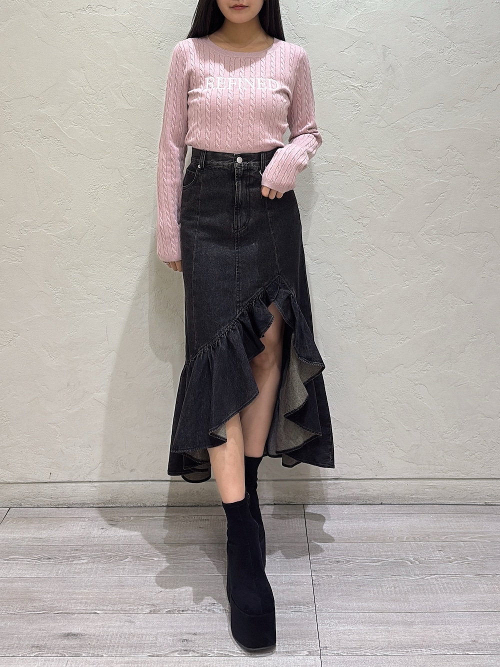 【トップス】 ケーブル編みのデザインがかわいいピンクニット🎀 スッキリな丈感なのでインしても、アウトできても使いやすいです♪ 【ボトムス】 アシンメトリーなデザインが可愛いデニムスカート♪ 生地が分厚すぎないので動きやすく、ウエストのゴムもしっかり伸びるのでかなり楽に履くことができます! スニーカーでもブーツでも可愛い💭 【ブーツ】 13cmのヒールがスタイルアップを叶えてくれるショートブーツです♪ 足回りをしっかりホールドしてくれるのでかなり歩きやすいのも嬉しいポイント🫧 ゆとりのあるサイズ感なので、普段Lサイズが履けないことの多い私でも履くことができました🙆♀️