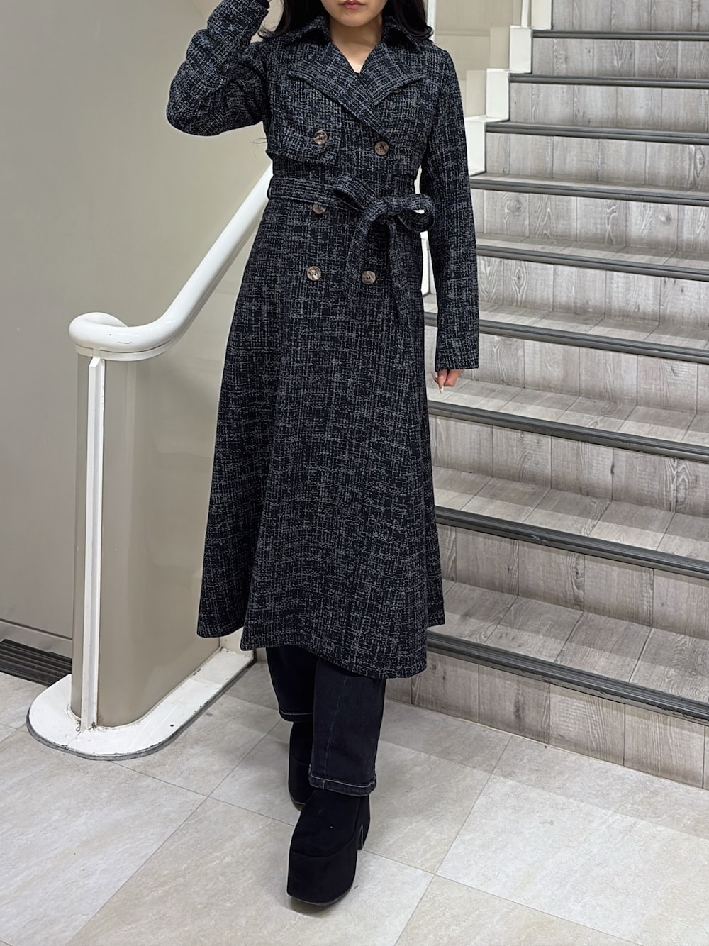 misaki(RESEXXY)のトレンチコート「2WAYツイードレイヤードコート」を使ったコーディネート