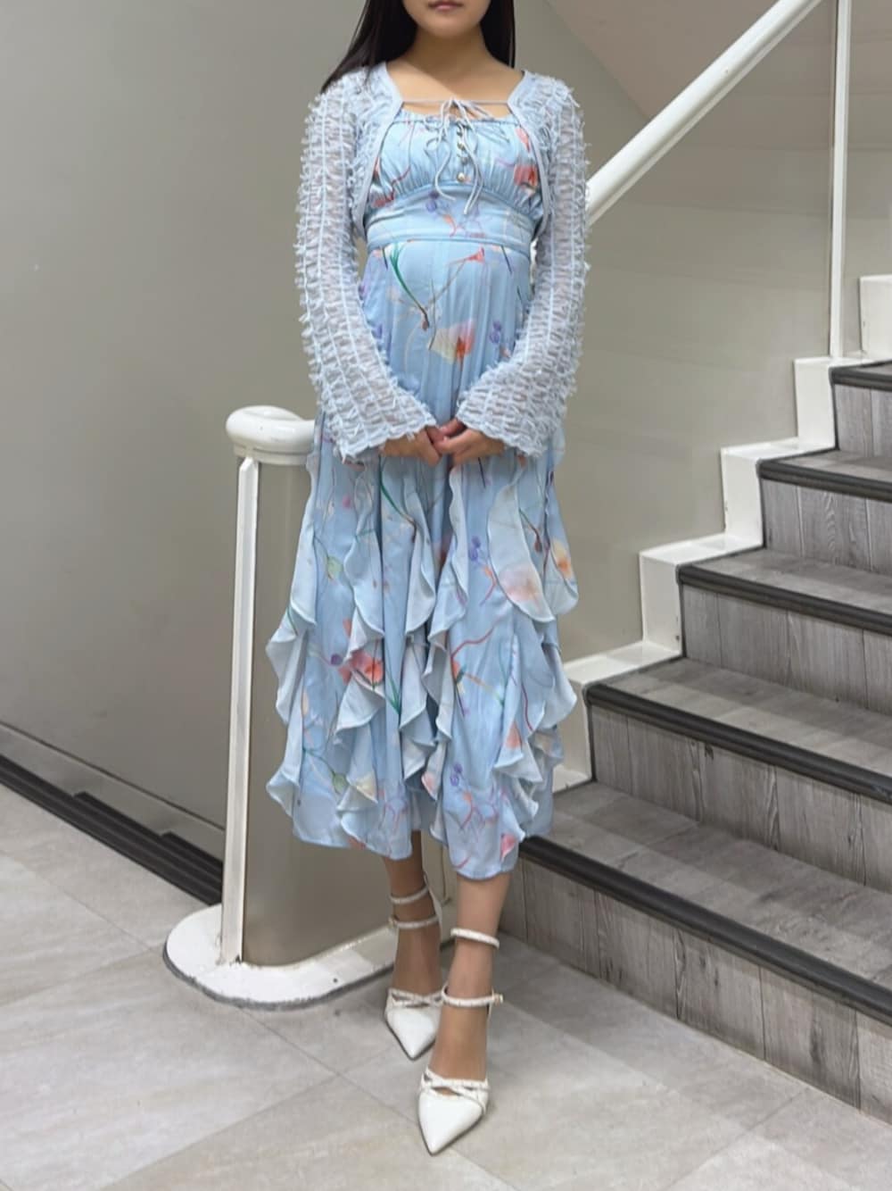【ワンピース】 柔らかい生地感と花柄で、これからの時期にぴったりなワンピースです✨ 中はキャミワンピになっていて、アジャスターで着丈が調節できるのが嬉しいポイント💭 夏に羽織なしの一枚でお召しいただけたり、お手持ちの羽織で合わせていただくのも可愛いです✨ 【シューズ】二重のベルトが可愛いパンプスです♪ ベルトの部分は3段階で調節が可能です! 爪先が細めの作りですが、これまでのRESEXXYのパンプスよりややゆとりがあるように感じました◎ 普段Lサイズが入らない私ですが、ベルトを調節して素足であれば問題なく履くことができました!