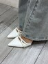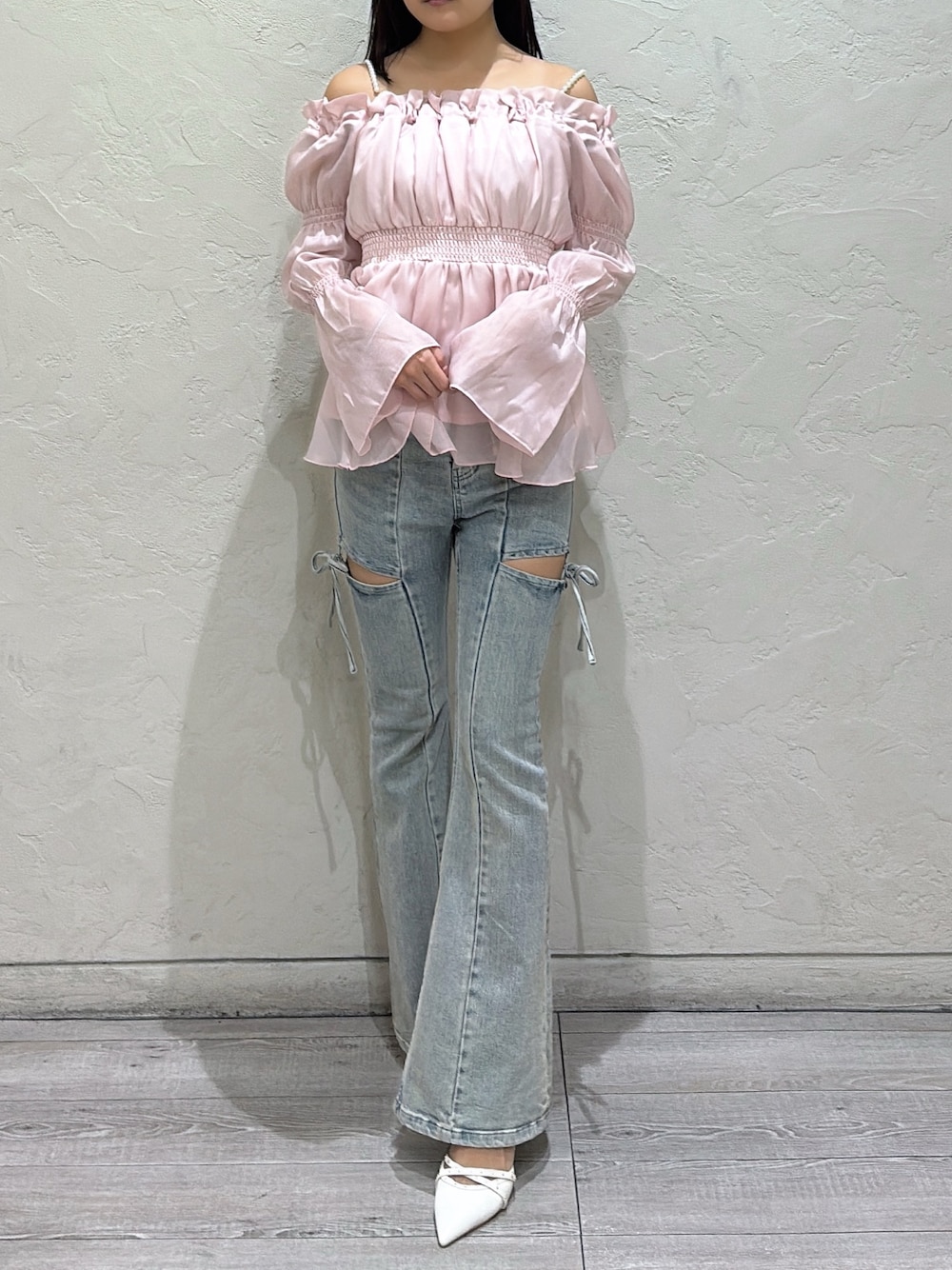 【トップス】 春らしい柔らかい生地感のオフショルトップスです✨ 肩紐がパールのチェーンになっていて、取り外しも可能です◎ 肩のゴムがしっかりしているので落ちてくる心配もなし✨ 【ボトムス】 大バズりした大人気デニムのアイスブルーカラーです🩵 暖かくなると薄い色のデニムが大活躍します✨ 長めに履くことで足がすらっと見えるので私はSサイズを着用しております♪ 【シューズ】 二重のベルトが可愛いパンプスです♪ ベルトの部分は3段階で調節が可能です! 爪先が細めの作りですが、これまでのRESEXXYのパンプスよりややゆとりがあるように感じました◎ 普段Lサイズが入らない私ですが、ベルトを調節して素足であれば問題なく履くことができました!