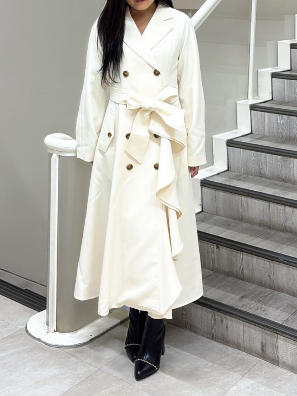 【アウター】 珍しいフロントデザインで、普段のコーデのアクセントになるコートです✨ リボンなしでお召しいただいてもウエスト周りは綺麗なシルエットです♪ 歩いた時にしっかり動きが出るのがおすすめポイント◎ 【シューズ】 爪先のチェーンデザインがお上品で可愛いブーツです✨ 足先が広めの作りなので、足が大きめな私でもLサイズで履くことができました◎ ワンピースなどはもちろん、デニム合わせでも可愛いです💭